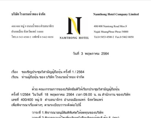 ประกาศประชุม บริษัท โรงพยาบาลแพร่พร้อมมิตร จำกัดเรื่อง ขอเชิญประชุมสามัญผู้ถือหุ้น ประจำปี 2564เรียน ท่านผู้ถือหุ้น ของบริษัท โรงพยาบาลแพร่พร้อมมิตร จำกัดตัวยคณะกรรมการของบริษัท โรงพยาบาลแพร่พร้อมมิตร จำกัด ได้มีมติให้เรียกประชุมสามัญผู้ถือหุ้น ครั้งที่ 1/2564 ที่ทำการของบริษัท โรงพยาบาลแพร่พร้อมมิตร จำกัด เลขที่ 3 ถนน ยันตรกิจ โกศล...