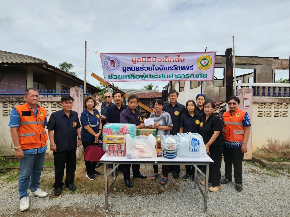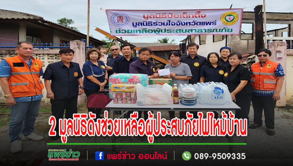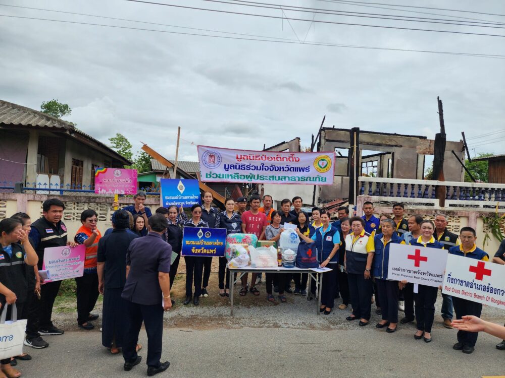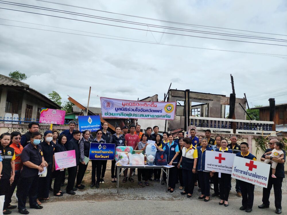 วันที่ 24 พฤษภาคม 2567 นางณัชชา มีจันทร์ นายกเหล่ากาชาด จ.แพร่ ประธานแม่บ้านมหาดไทย จ.แพร่ และคณะฯ มูลนิธิป่อเต็กตึ๊ง โดย ดร.วิเชียร เตชะไพบูลย์ ประธานฯ ร่วมกับ มูลนิธิร่วมใจจังหวัดแพร่ โดย นายสมหวัง พึ่งทรัพย์ชัยกุล ประธานฯ และคณะฯ พร้อมด้วย -สำนักงานป้องกันและบรรเทาสาธารณภัย จ.แพร่ โดย น.ส.รำพู จันต๊ะปะตุ หัวหน้าฯ และคณะฯ นางอุไรวรรณ โสภารัตน์ นายก อบต.แม่ยางฮ่อ ร่วมกัน มอบเงินสด 9,000 บาท และเครื่องอุปโภค-บริโภค มูลค่า 1,500บาท รวมทั้งสิ้น 10,500 บาท ให้ความช่วยเหลือเบื้องต้นแก่ ครอบครัว น.ส.สุธาชินี วรรณสมพร ผู้ประสบอัคคีภัยเมื่อวันที่ 21พ.ค.67 เวลา 14.30 น. ที่ผ่านมา เสียหายทั้งหลัง มีผู้เดือดร้อน 3 คน ณ บ้านเลขที่ 72 ม.4 ต.แม่ยางฮ่อ อ.ร้องกวาง จ.แพร่