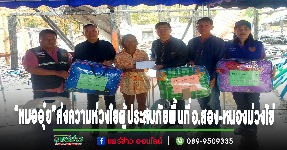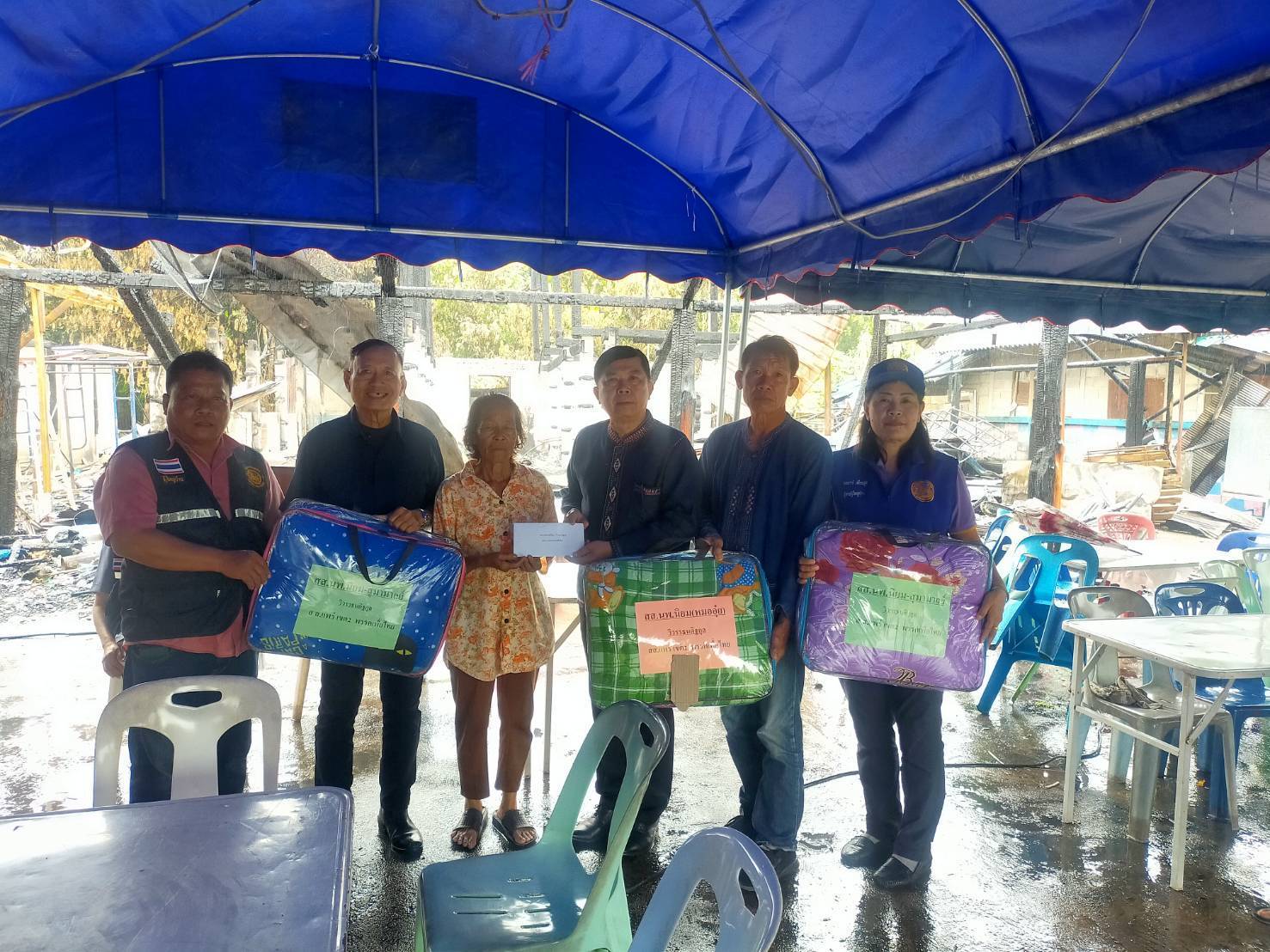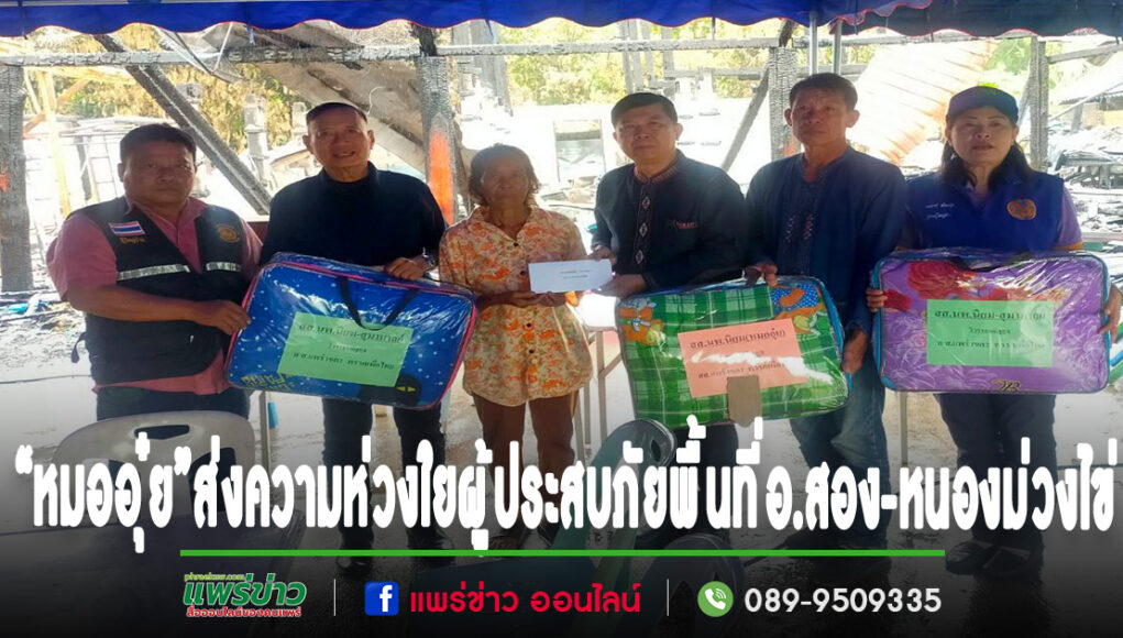 จากนั้น เวลา 12.00 น.ได้เดินทางให้กำลังใจแก่นายสุรินทร์ บุญมามี ผู้ประสบภัยไฟไหม้บ้าน บ้านเลขที่ 213 ม.6 บ้านสันปู่สี ต.หัวเมือง อ.สอง จ.แพร่ มอบผ้าห่มและยารักษาโรคกับปัจจัยให้กับผู้เสียหายเพื่อเป็นขวัญและกำลังใจในการดำรงชีวิตต่อไป โดยมีนายเดช ยี่ดวง กำนันตำบลหัวเมืองและนายทวน ยศไทย ผู้ใหญ่บ้านม.6 เป็นตัวแทนรับมอบ
