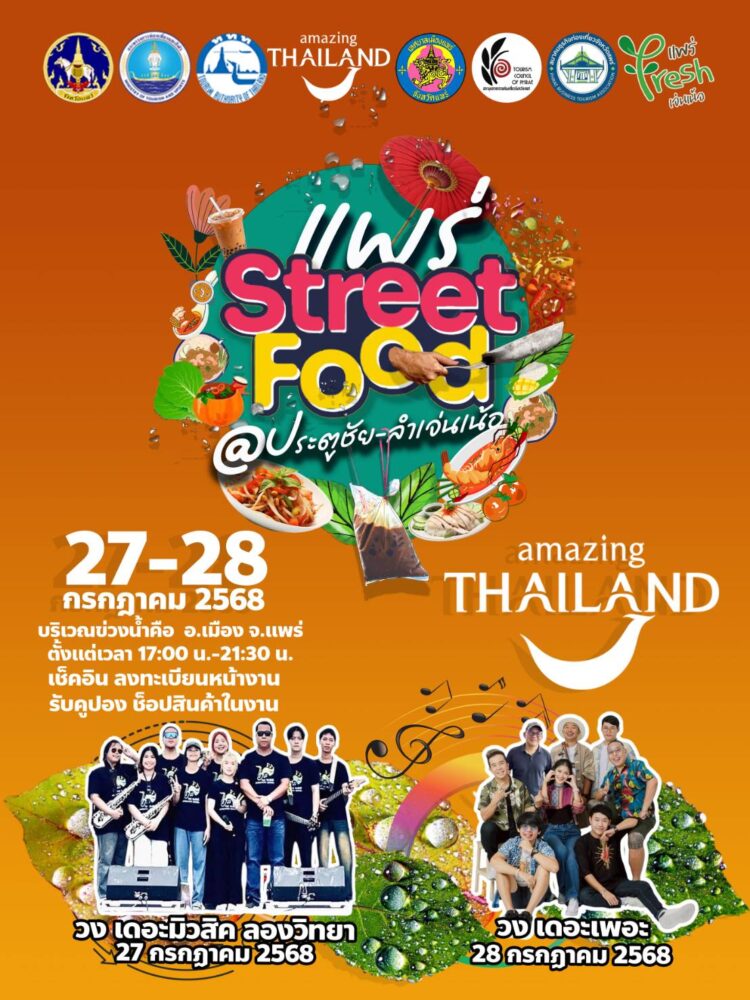 การท่องเที่ยวแห่งประเทศไทย (ททท.) สำนักงานแพร่ สำนักงานการท่องเที่ยวและกีฬาจังหวัดแพร่ สภาอุตสาหกรรมท่องเที่ยวจังหวัดแพร่ ร่วมกับ ชมรมผู้ประกอบการร้านอาหารและแผงลอยจังหวัดแพร่ และพันธมิตรด้านการท่องเที่ยวในพื้นที่จังหวัดแพร่ จัดงาน “Phrae Street Food @ ประตูชัย : ลำเจ่นเน้อ” ในวันที่ 27 – 28 กรกฎาคม 2568 ตั้งแต่เวลา 17.00 น. – 21.30 น. ณ บริเวณข่วงน้ำคือ ตำบลในเวียง อำเภอเมืองแพร่ จังหวัดแพร่ เพื่อกระตุ้นการท่องเที่ยวในช่วงฤดูกาล Green Season หน้าฝนของจังหวัดแพร่ สร้างจุดขายใหม่ ยกระดับย่านประตูชัยแพร่ สู่สวรรค์ของนักเดินกิน เพิ่มวันพักเกิดการหมุนเวียนของเศรษฐกิจในพื้นที่ที่เกิดจากคนภายในจังหวัดแพร่และนักท่องเที่ยว ตอกย้ำวลีฮิตติดปากคุ้นหู “ลำเจ่นเน้อ” ด้วยเอกลักษณ์แบบบ้านๆ เต็มอิ่มกับเมนูท้องถิ่นกว่า 60 ร้าน อาทิ ร้านบ๊วยนมสด ร้านแต๋วรวมมิตร ร้านเย็นตาโฟป้าแป้ง เสิร์ฟความอร่อยแบบ “ลำเจ่นเน้อ” ท่ามกลางความสุข ความสนุก จากศิลปินชั้นนำ (วงเดอะมิวสิค ลองวิทยา วงเดอะเพอะ) และกิจกรรมที่น่าสนใจรับของรางวัลตลอดทั้งงาน
