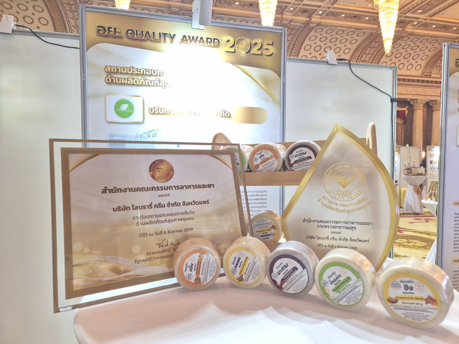 เมื่อวันที่ 6 สิงหาคม 2568 ณ อิมแพ็ค อารีน่า เมืองทองธานี บริษัท ไลบรารี่กรีน จำกัด ผู้ผลิตเครื่องสำอางสมุนไพร ภายใต้แบรนด์ “อัญญาเฮิร์บ” และ “ไลบรารี่” จังหวัดแพร่ สร้างชื่อเสียงให้กับท้องถิ่น ด้วยการคว้ารางวัล “อย. ควอลิตี้ อวอร์ด 2025” ด้านผลิตภัณฑ์สุขภาพชุมชน จากสำนักงานคณะกรรมการอาหารและยา กระทรวงสาธารณสุข โดยมี นายสมศักดิ์ เทพสุทิน รัฐมนตรีว่าการกระทรวงสาธารณสุข เป็นผู้มอบรางวัล