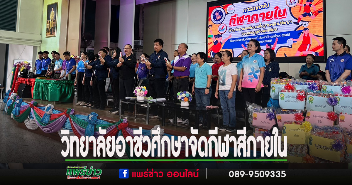 เมื่อเวลา 08.00 น. วันที่ 8 ส.ค.68 วิทยาลัยอาชีวศึกษาแพร่ จัดการแข่งขันการแข่งขันกีฬาสีภายใน ต้านภัยยาเสพติด บนพื้นฐานหลักปรัชญาของเศรษฐกิจพอเพียง ประจำปีการศึกษา 2568 ณ สนามกีฬาชั่วคราว วิทยาลัยอาชีวศึกษาแพร่ โดยมีขบวนแห่ทั้ง 4 สี ประกอบด้วย สีแดง สีน้ำเงิน สีเขียว และสีม่วง อย่างยิ่งใหญ่เริ่มต้นขบวน ณ ตลาดแพร่ปรีดา ผ่านถนนช่อแฮ มาถึงแยกเจริญเมืองจากนั้นขบวนเข้าสู่วิทยาลัยอาชีวศึกษา และมีพิธีเปิด โดยมี นายอนรรฆ ชนาธินาถพงศ์ ผอ.วิทยาลัยอาชีวศึกษาแพร่ เป็นประธานในพิธีเปิด นางสาวกิจฤทัย วอนสร้อย นายกองค์การนักวิชาชีพในอนาคตแห่งประเทศไทย ระดับสถานศึกษา กล่าวรายงาน