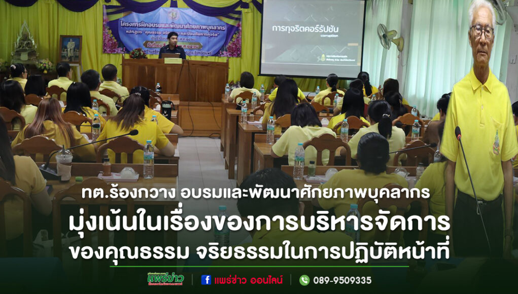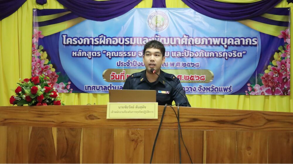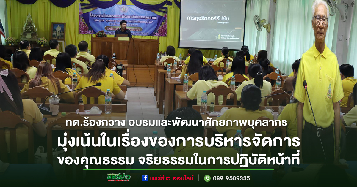 วันจันทร์ที่ 25 สิงหาคม 2568 เวลา 09.00 น. นายพิพัฒน์ ซื่อทรงธรรม นายกเทศมนตรีตำบลร้องกวาง มอบหมายให้นายอัศวิน วรรณจรรยา รองนายกเทศมนตรีตำบลร้องกวาง เป็นประธานเปิดโครงการฝึกอบรมและพัฒนาศักยภาพบุคลากรหลักสูตร “คุณธรรม จริยธรรม และป้องกันการทุจริต” ประจำปีงบประมาณ พ.ศ. 2568 ให้แก่คณะผู้บริหาร หัวหน้าส่วนราชการ พนักงานเจ้าหน้าที่เทศบาลตำบลร้องกวาง ตามนโยบายของคณะผู้บริหารที่มุ่งเน้นในเรื่องของการบริหารจัดการโดยเน้นเรื่องของคุณธรรม จริยธรรม และป้องกันการทุจริตในการปฏิบัติหน้าที่ โดยมีนางสาวรุ่งอรุณ วันจา ผู้อำนวยการกองการศึกษา รักษาราชการแทนปลัดเทศบาลตำบลร้องกวาง ได้กล่าววัตถุประสงค์ของการจัดงาน และได้รับเกียรติจากคุณชัชวัลย์ ตันสุหัช และคุณขวัญข้าว แสนบ่อ เจ้าพนักงานป้องกันการทุจริต สำนักงานป้องกันและปราบปรามการทุจริตแห่งชาติประจำจังหวัดแพร่ เป็นวิทยากรบรรยายให้ความรู้
