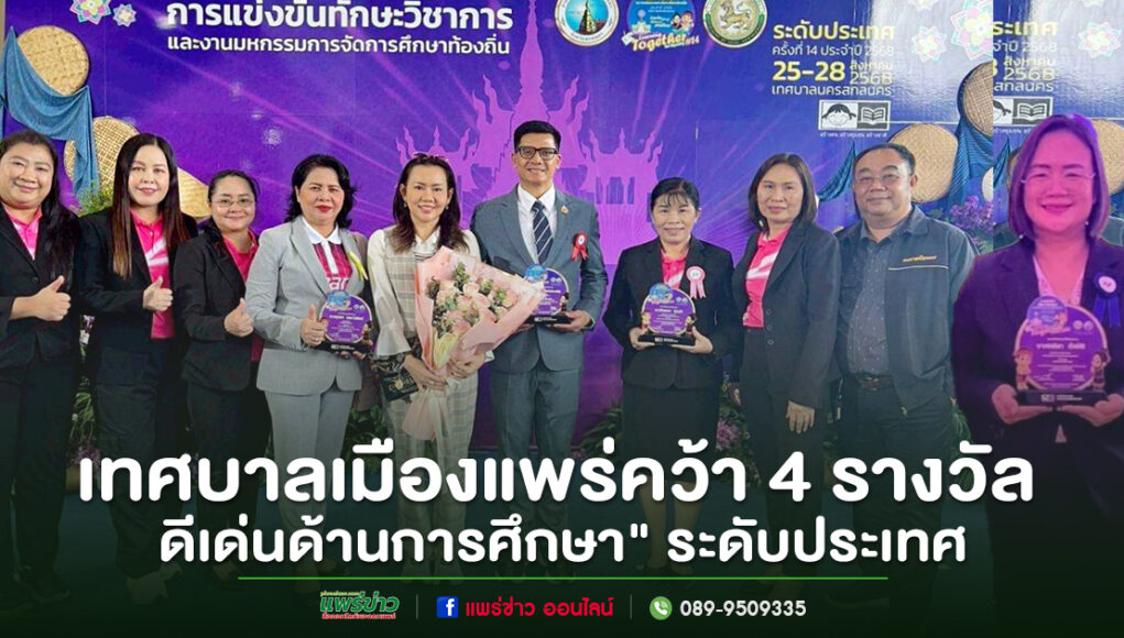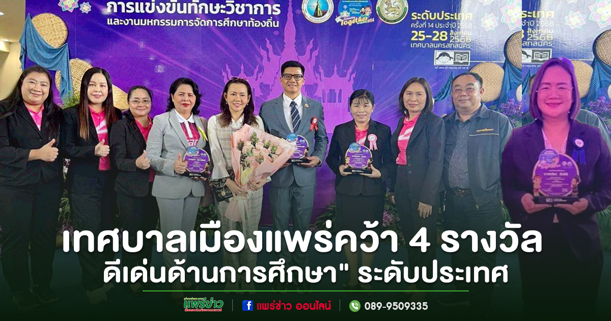 วันที่ 28 สิงหาคม 2568 เทศบาลเมืองแพร่ได้รับรางวัลอันทรงเกียรติถึง 4 รางวัล ซึ่งเป็นเครื่องสะท้อนถึงความมุ่งมั่นตั้งใจของเทศบาลในการพัฒนาคุณภาพการศึกษาอย่างต่อเนื่อง โดยมีรายนามผู้ได้รับรางวัลดังนี้