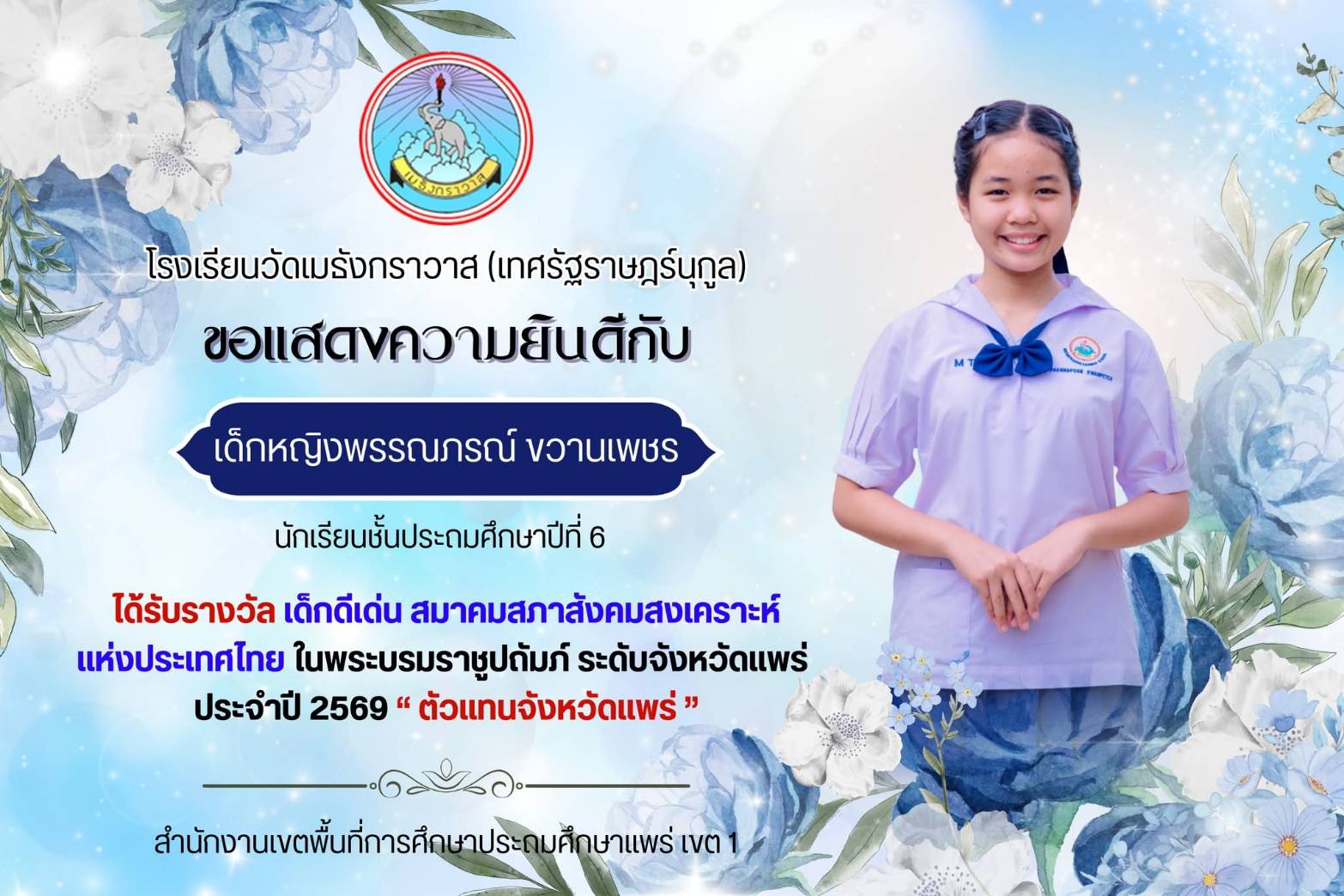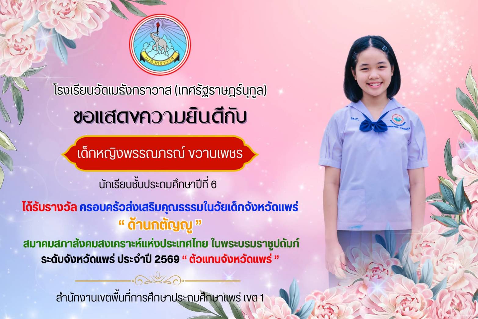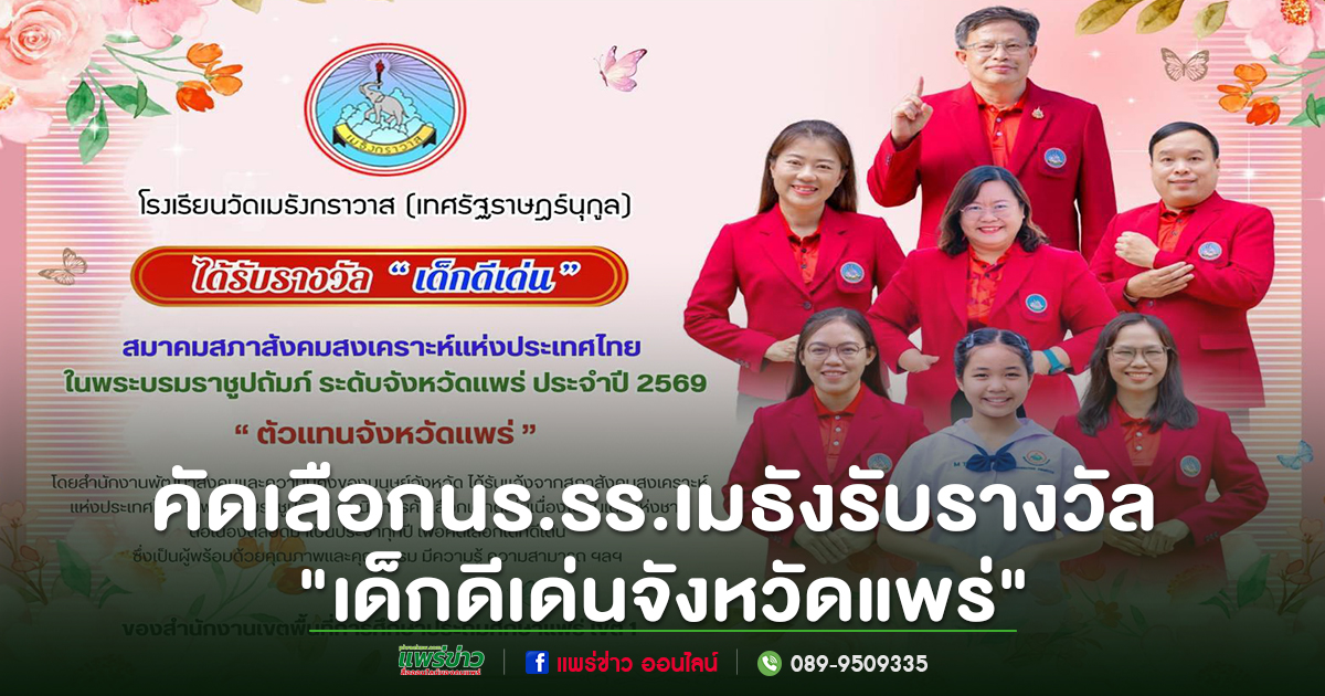 นายปรีชาชาญ อินทรชิต ผู้อำนวยการโรงเรียนวัดเมธังการวาส สพป.แพร่ เขต 1แจ้งว่า ตามที่ สำนักงานพัฒนาสังคมและละความมั่นคงของมนุษย์จังหวัดแพร่ ได้รับแจ้งจากสภาสังคมสงเคราะห์แห่งประเทศไทย ในพระบรมราชูปถัมภ์ ให้ดำเนินการคัดเลือกเด็กดีเด่นเนื่องในวันเด็กแห่งชาติ ระดับจังหวัดแพร่ ประจำปี 2569 นั้น ผลการคัดเลือกปรากฏว่า เด็กหญิงพรรณภรณ์ ขวานเพชร นักเรียนชั้นประถมศึกษาปีที่ 6 ได้รับการคัดเลือกเป็น “เด็กดีเด่นจังหวัดแพร่” และ “ครอบครัวส่งเสริมคุณธรรมในวัยเด็กจังหวัดแพร่ ด้านกตัญญู” เนื่องในวันเด็กแห่งชาติ ประจำปี 2569 ของสมาคมสภาสังคมสงเคราะห์แห่งประเทศไทย ในพระบรมราชูปถัมภ์ ตัวแทนจังหวัดแพร่ เข้าร่วมคัดเลือกรอบระดับประเทศต่อไป