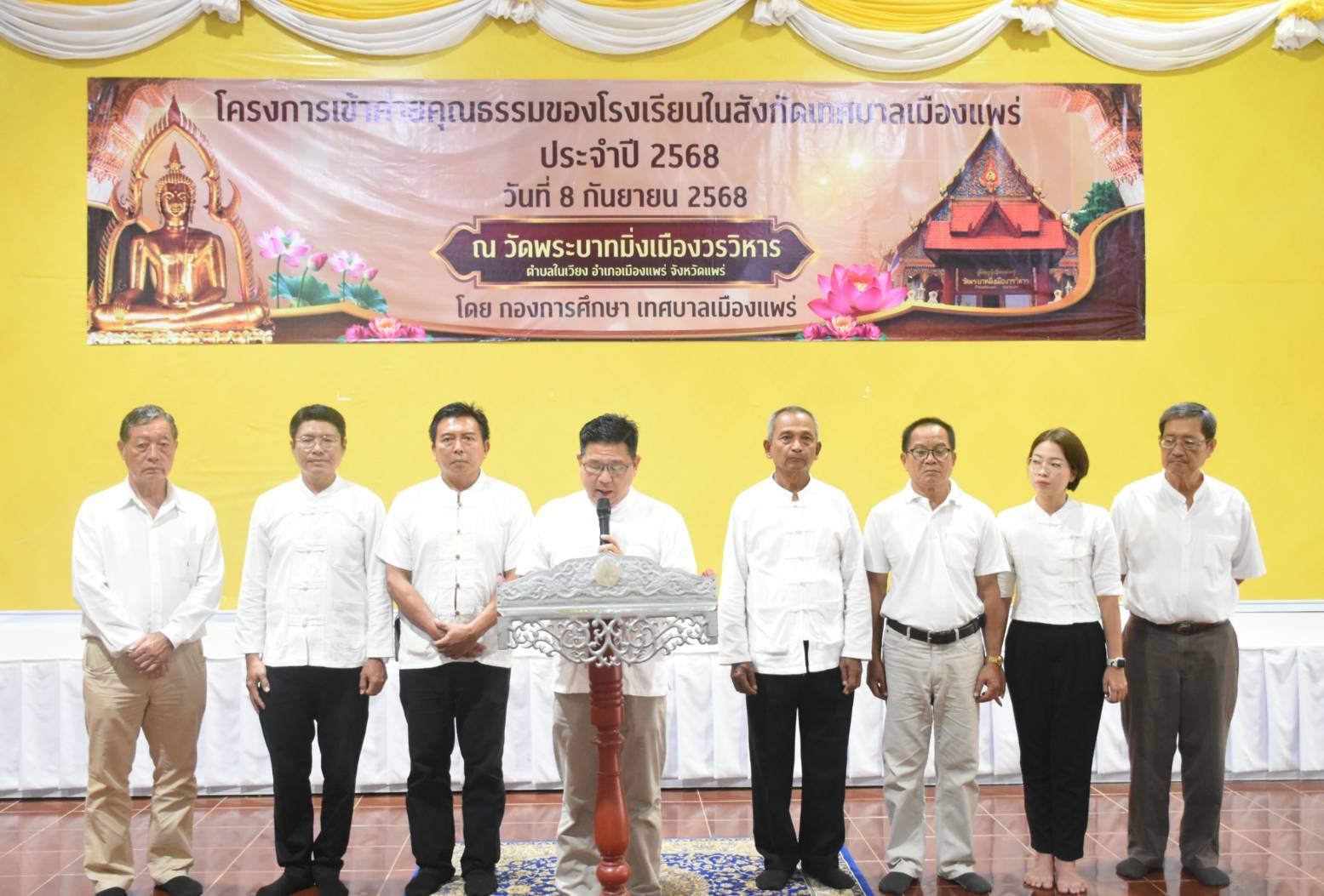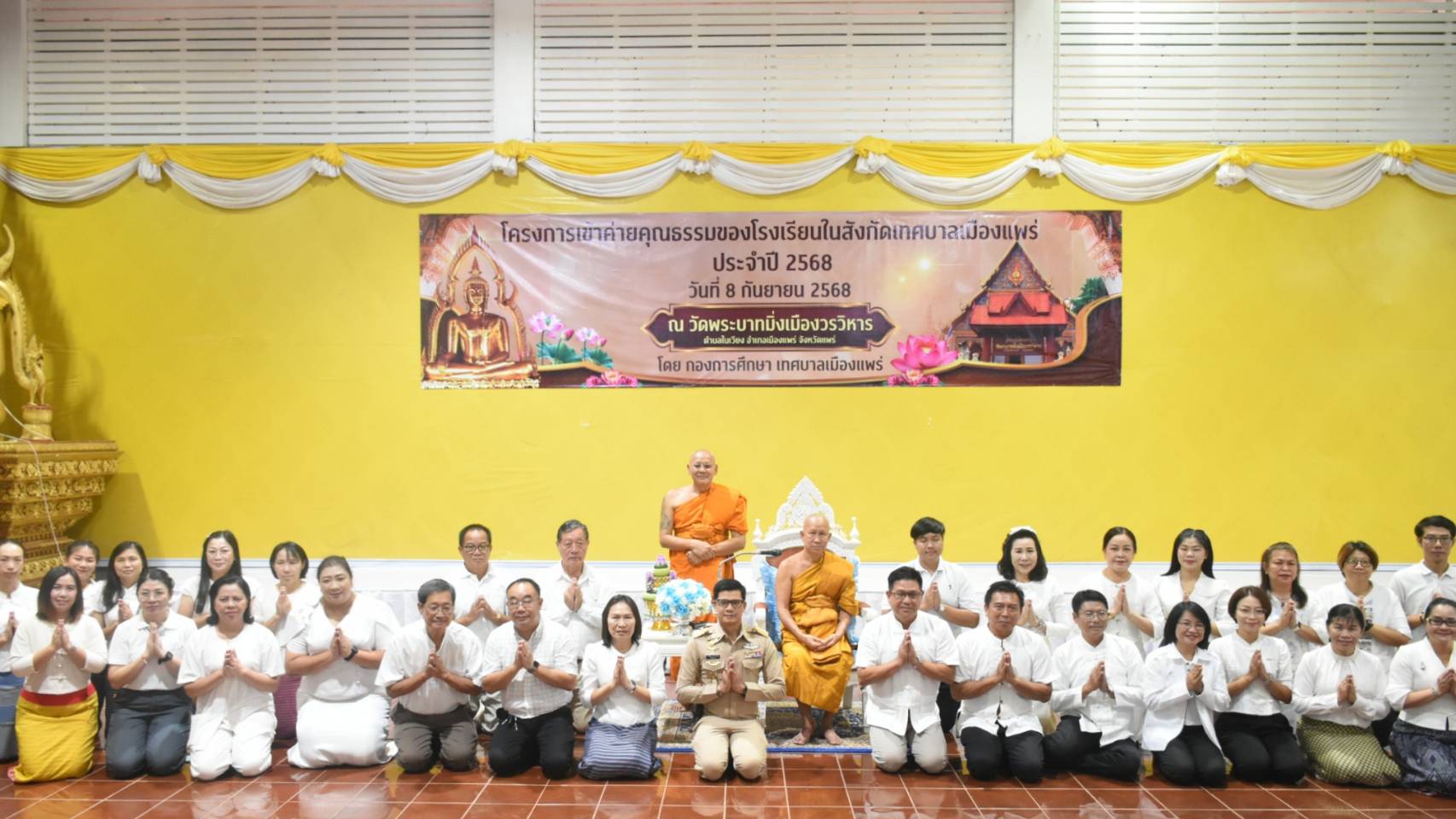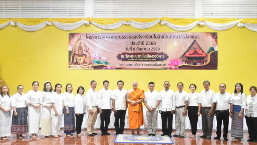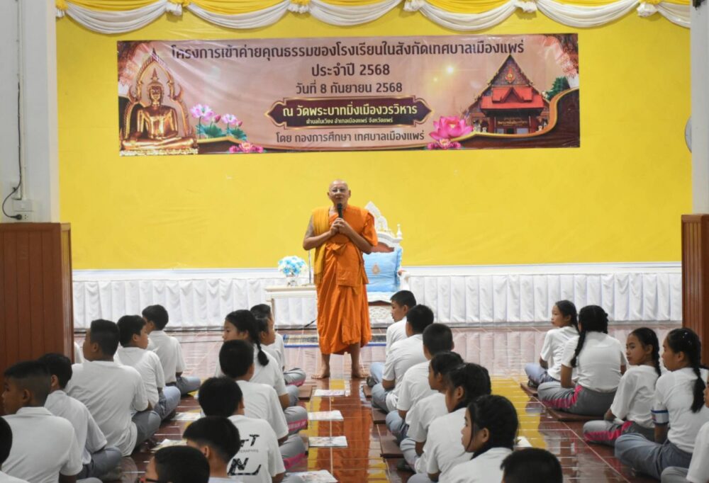 วันที่ 8 กันยายน 2568 เวลา 09.00 น.ณ วัดพระบาทมิ่งเมืองวรวิหาร นายสน ลือวัฒนานนท์ รองนายกเทศมนตรีเมืองแพร่ ได้รับมอบหมายจากนายสุริยา อินต๊ะนอน นายกเทศมนตรีเมืองแพร่ เป็นประธานในพิธีเปิดโครงการเข้าค่ายคุณธรรมของโรงเรียนในสังกัดเทศบาลเมืองแพร่ เพื่อส่งเสริมให้นักเรียนมีคุณธรรม จริยธรรม ปลูกฝังจิตสำนึกที่ดีงาม และสามารถนำหลักธรรมคำสอนไปปรับใช้ในชีวิตประจำวันได้อย่างเหมาะสม