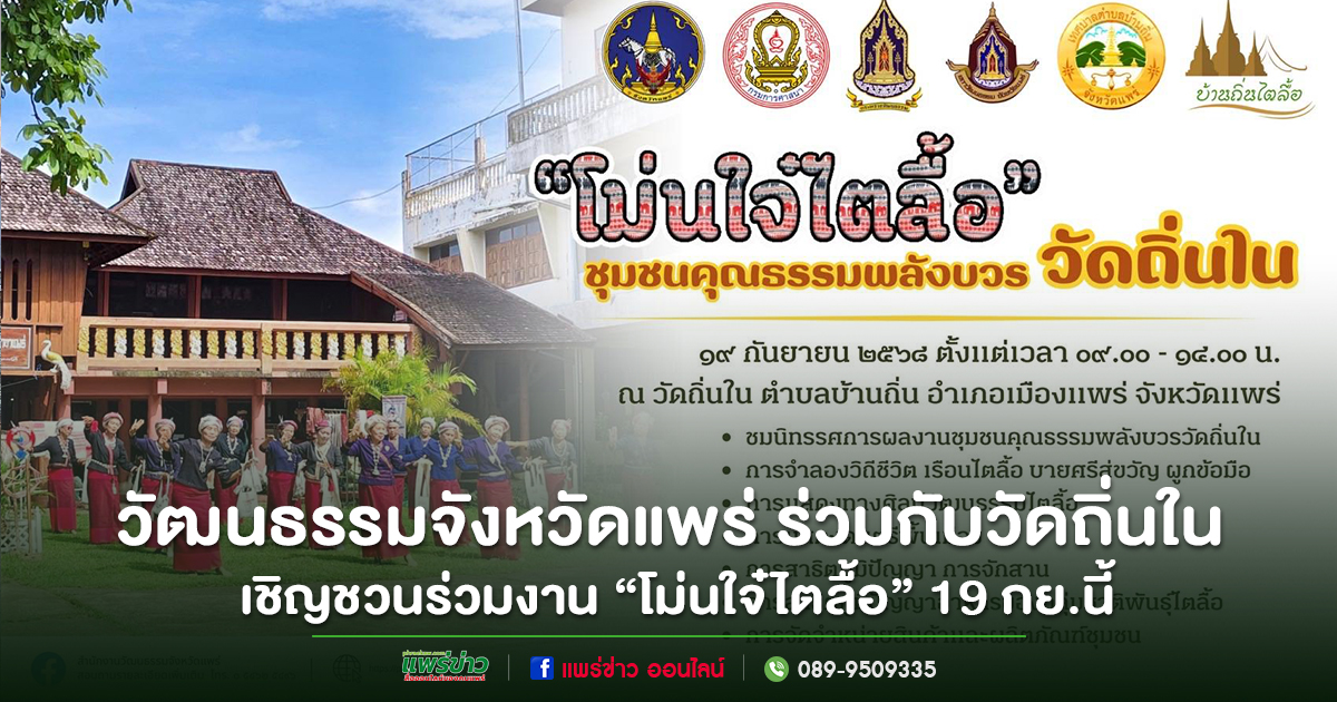 ชุมชนคุณธรรมพลังบวรวัดถิ่นใน จัดกิจกรรมหลากหลาย วันที่ 19 กันยายน 2568 ณ วัดถิ่นใน ตำบลบ้านถิ่น อำเภอเมืองแพร่ สำนักงานวัฒนธรรมจังหวัดแพร่ ร่วมกับวัดถิ่นใน ขอเชิญชวนประชาชนทุกภาคส่วน และเครือข่ายชุมชนคุณธรรมพลังบวร เข้าร่วมงาน “โม่นใจ๋ไตลื้อ” ชุมชนคุณธรรมพลังบวรวัดถิ่นใน ในวันพฤหัสบดีที่ 19 กันยายน 2568 เวลา 09.00 – 14.00 น. ณ วัดถิ่นใน ตำบลบ้านถิ่น อำเภอเมือง จังหวัดแพร่