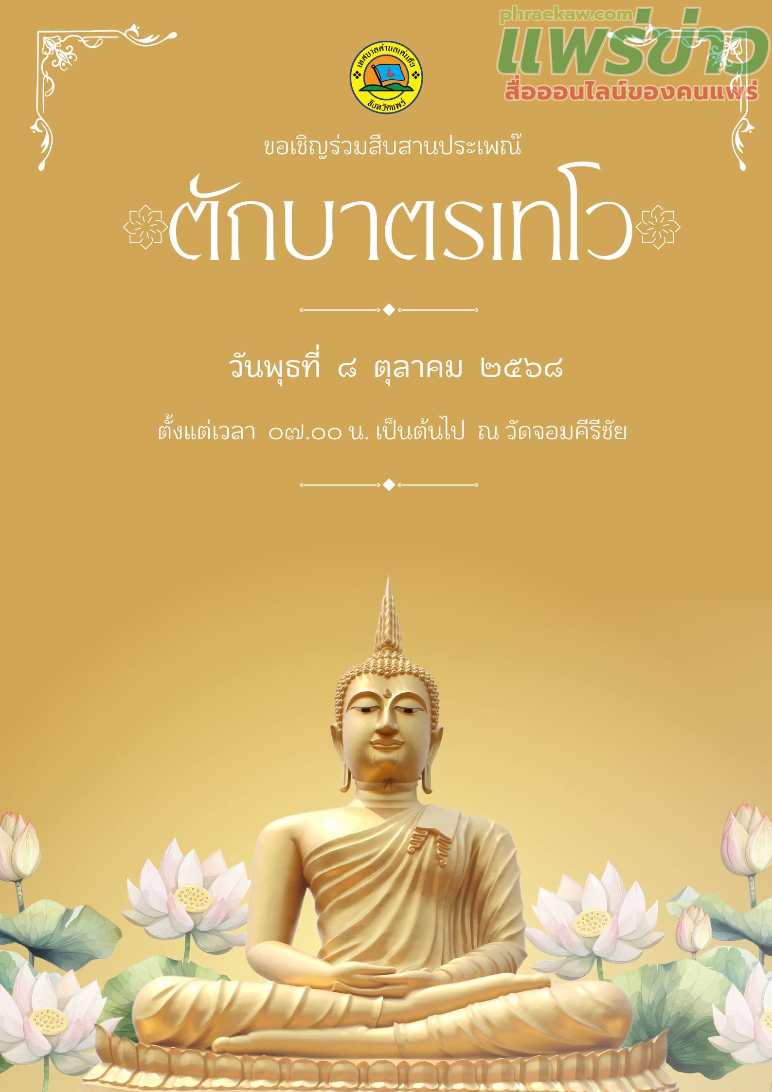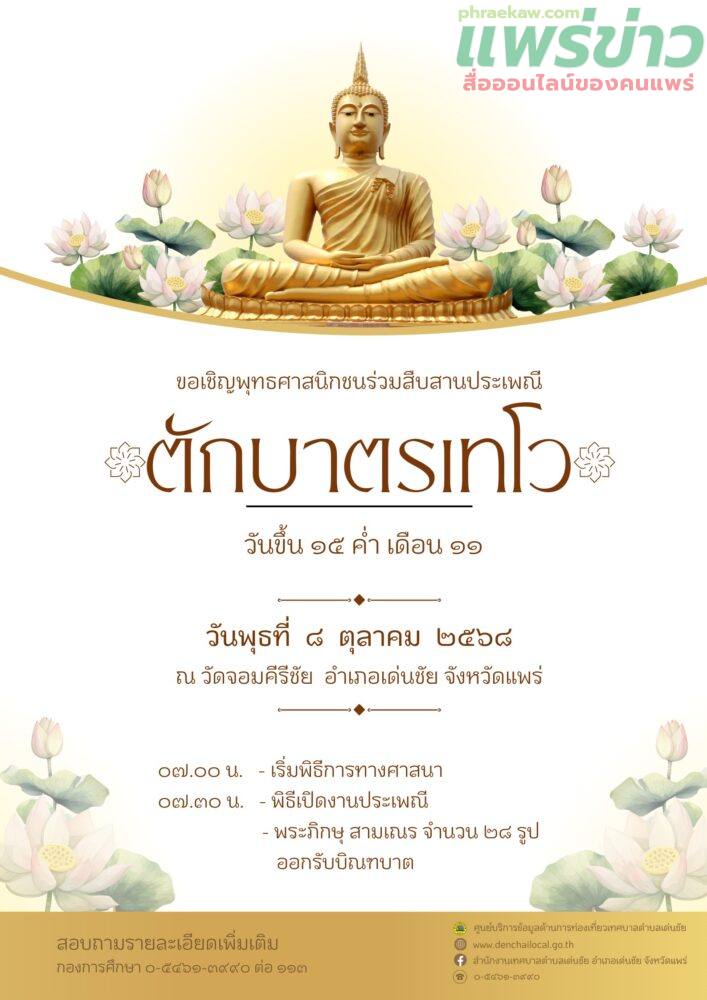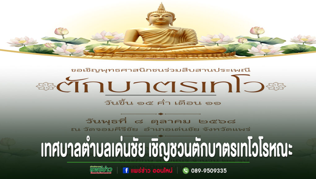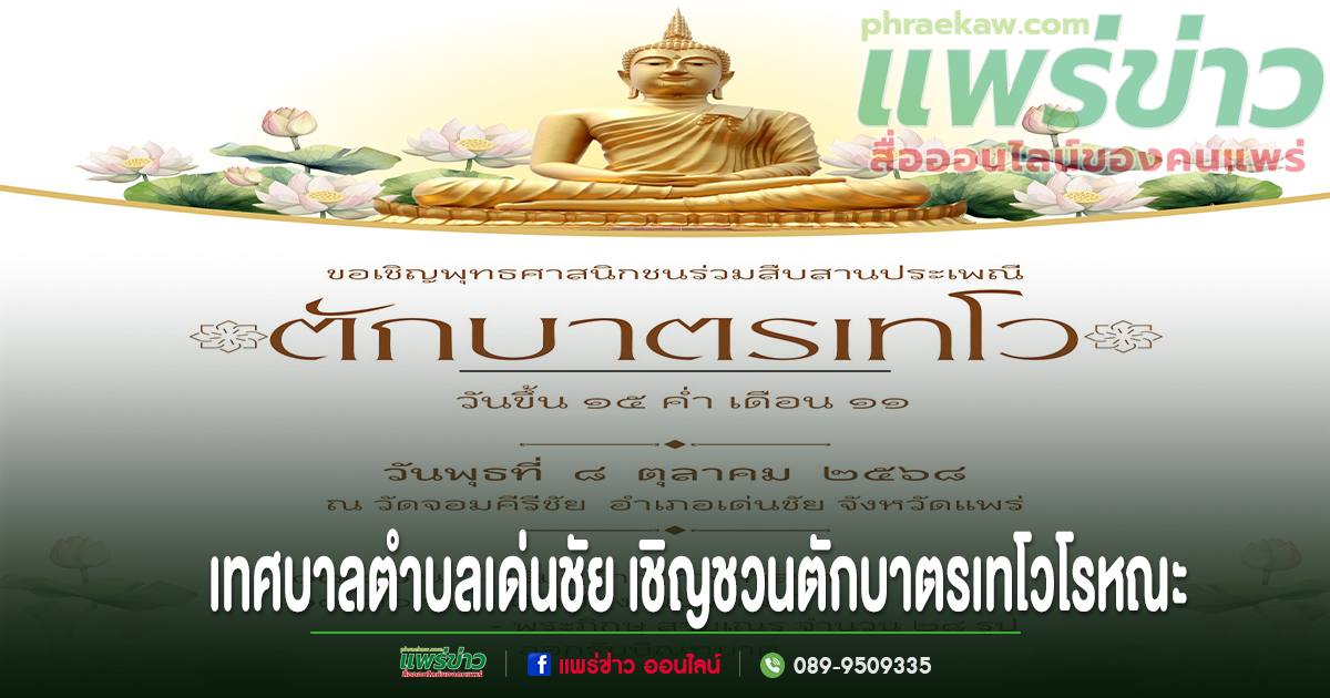 เทศบาลตำบลเด่นชัย ขอเชิญชวนพี่น้องประชาชนชาวอำเภอเด่นชัยและใกล้เคียง ได้ร่วมสืบสาน อนุรักษ์วัฒนธรรมประเพณีอันดีงามสืบไป ในงานประเพณีเทศบาลตำบลเด่นชัย ร่วมใจตักบาตรเทโวโรหณะ ประจำปี 2568 ในวันพุธที่ 8 ตุลาคม 2568 เวลา 07.๐0 น.เป็นต้นไป ณ วัดจอมคีรีชัย(วัดห้วยกูด) หมู่ที่ 5 ตำบลเด่นชัย อำเภอเด่นชัย จังหวัดแพร่ โดยพร้อมเพรียงกัน