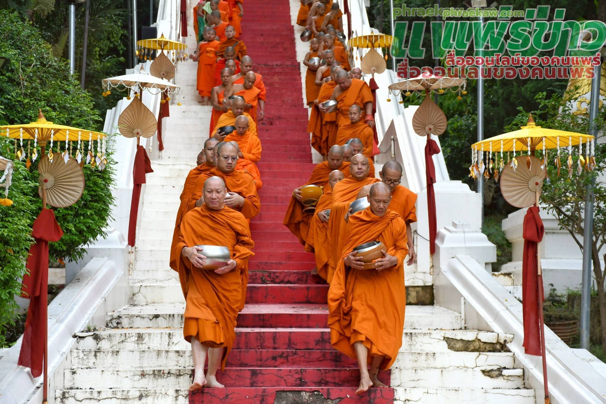 โดยมีขบวนพระภิกษุสงฆ์ เคลื่อนขบวนจากซุ้มศรีวิชัย วัดพระธาตุช่อแฮ พระอารามหลวง เดินลงบันไดสิงห์ โดยสมมุติเป็น “สิริมหามายากุตาคาร” สถานที่พระพุทธเจ้าทรงเทศนาโปรดพระพุทธมารดา แล้วเสด็จกลับสู่โลกมนุษย์ ลงบันได นำด้วยพระพุทธรูปปางเปิดโลก เปรียบเสมือนพระพุทธเจ้าเสด็จจากดาวดึงส์ ลงมารับบิณฑบาตข้าวสารอาหารแห้ง จากส่วนราชการ พ่อค้า ประชาชน และนักเรียน เพื่อถวายเป็นพุทธบูชาแด่สมเด็จพระสัมมาสัมพุทธเจ้า