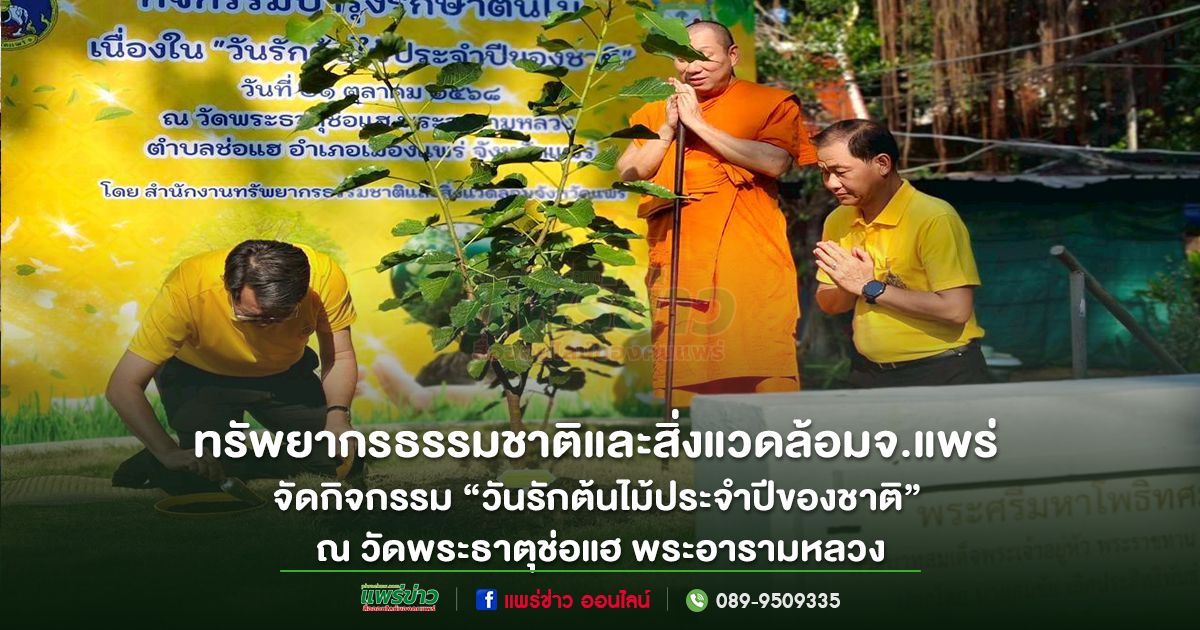 วันที่ 21 ตุลาคม 2568 เวลา 15.30 น.นายสมชัย เลิศประสิทธิพันธ์ ผู้ว่าราชการจังหวัดแพร่ เป็นประธานเปิดงาน “วันรักต้นไม้ประจำปีของชาติ” ณ วัดพระธาตุช่อแฮ พระอารามหลวง อำเภอเมืองแพร่ จังหวัดแพร่ โดยมี นายบทมากร ศรีสุวรรณ ผู้อำนวยการสำนักงานทรัพยากรธรรมชาติและสิ่งแวดล้อมจังหวัดแพร่ กล่าวรายงาน