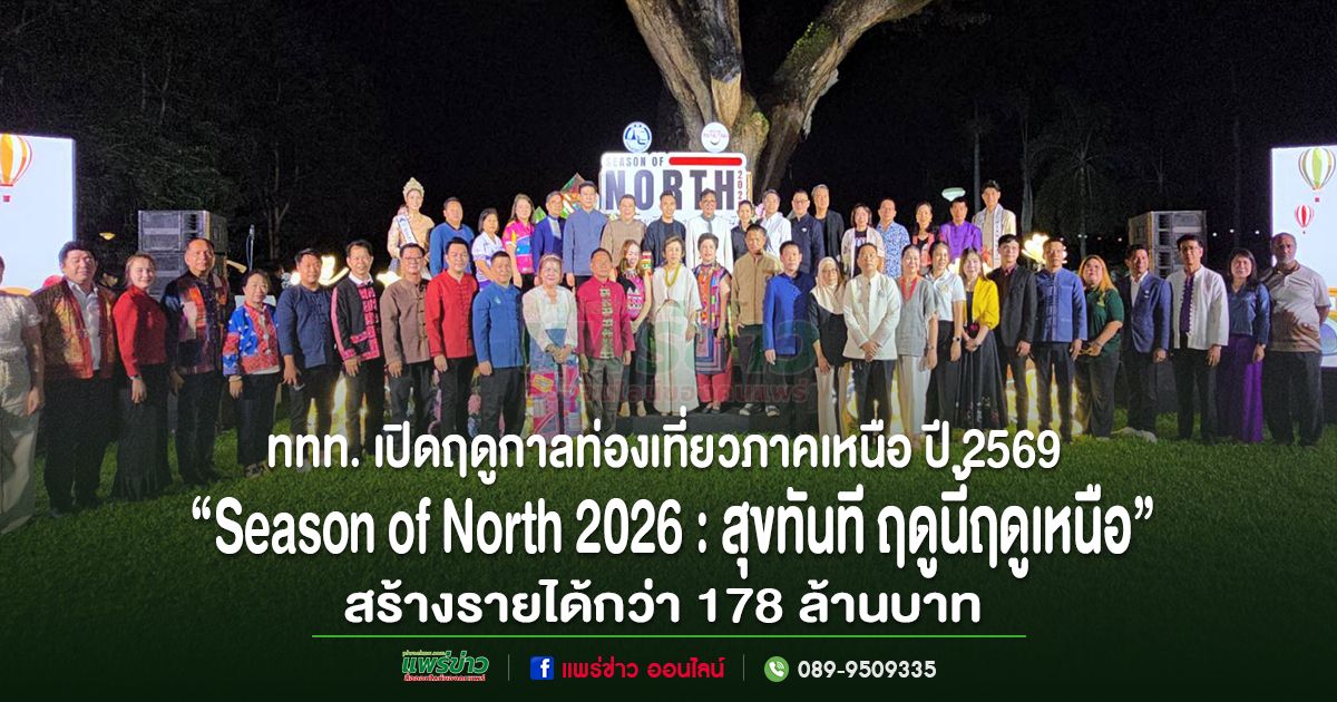 วันที่ 24 ตุลาคม 2568 ลานจัดงาน จังหวัดเชียงใหม่ การท่องเที่ยวแห่งประเทศไทย (ททท.) ร่วมกับจังหวัดเชียงใหม่ เปิดแคมเปญใหญ่ “Season of North 2026 : สุขทันที…ฤดูนี้ฤดูเหนือ” ชูคอนเซ็ปต์ส่งเสริมการท่องเที่ยวภาคเหนือในช่วงไฮซีซัน กระตุ้นเศรษฐกิจและสร้างรายได้รวมกว่า 178 ล้านบาท