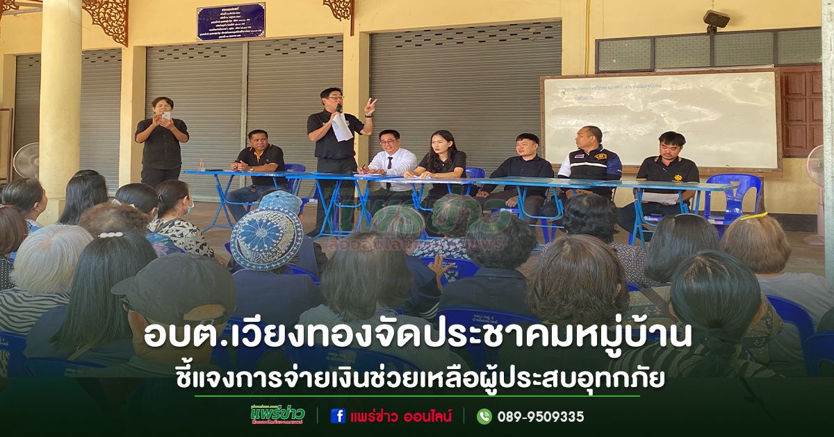 วันที่ 30 ตุลาคม 2568 องค์การบริหารส่วนตำบลเวียงทอง นำโดย นายสมยศ ยอดสอน รองปลัดองค์การบริหารส่วนตำบลเวียงทอง รักษาราชการแทนปลัดองค์การบริหารส่วนตำบลเวียงทอง พร้อมด้วยเจ้าหน้าที่ อบต.เวียงทอง และผู้นำชุมชน ร่วมจัดประชาคมหมู่บ้าน เพื่อชี้แจง หลักเกณฑ์ เงื่อนไข และวิธีการจ่ายเงินช่วยเหลือผู้ประสบอุทกภัยในช่วงฤดูฝน ปี 2568