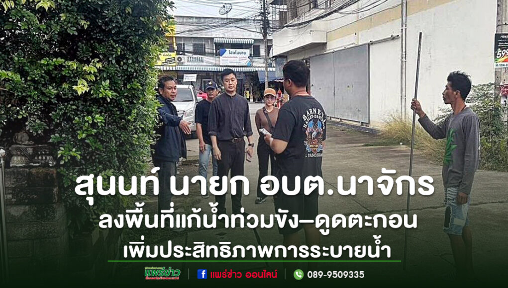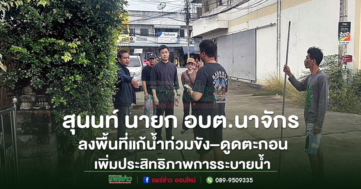 นายสุนนท์ จิตใจ นายกองค์การบริหารส่วนตำบลนาจักร ลงพื้นที่ติดตามปัญหาน้ำท่วมขังในพื้นที่จริง โดยร่วมกับทีมงาน อบต.นาจักร ผู้ใหญ่บ้านหมู่ 2 และหมู่ 9 ตำบลนาจักร อำเภอเมือง จังหวัดแพร่ ตรวจสอบการดำเนินงานโครงการดูดเศษดินและตะกอนในท่อระบายน้ำ บริเวณบ้านโกศัยประชาพัฒนา หมู่ที่ 2 และบ้านน้ำทอง หมู่ที่ 9