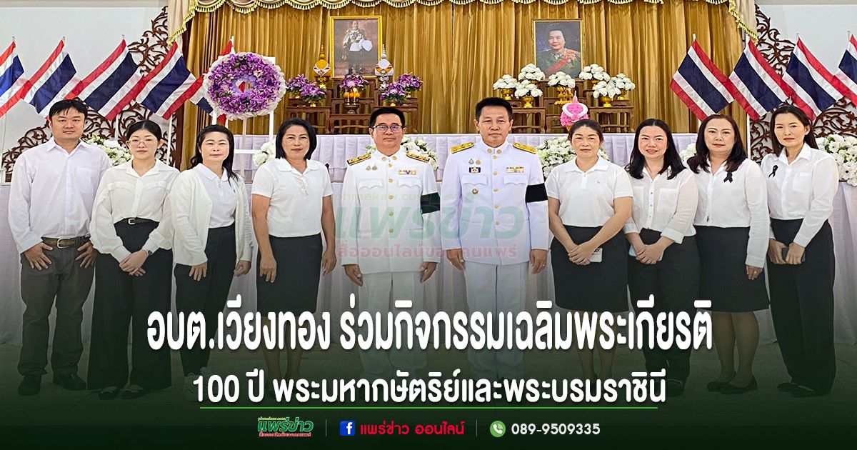 วันที่ 25 พฤศจิกายน 2568 เวลา 07.00 น. นายเสรี เวียงนาค นายกองค์การบริหารส่วนตำบลเวียงทอง มอบหมายให้ นายสมยศ ยอดสอน รองปลัด อบต.เวียงทอง รักษาราชการแทนปลัดองค์การบริหารส่วนตำบลเวียงทอง พร้อมด้วยเจ้าหน้าที่ เข้าร่วมกิจกรรมเฉลิมพระเกียรติพระบาทสมเด็จพระมงกุฎเกล้าเจ้าอยู่หัว เนื่องในโอกาสวันคล้ายวันสวรรคตครบ 100 ปี และสมเด็จพระนางเจ้าภคินีเธอ เจ้าฟ้าเพชรรัตนราชสุดาฯ เนื่องในวันคล้ายวันประสูติครบ 100 ปี ณ หอประชุมที่ว่าการอำเภอสูงเม่น จังหวัดแพร่