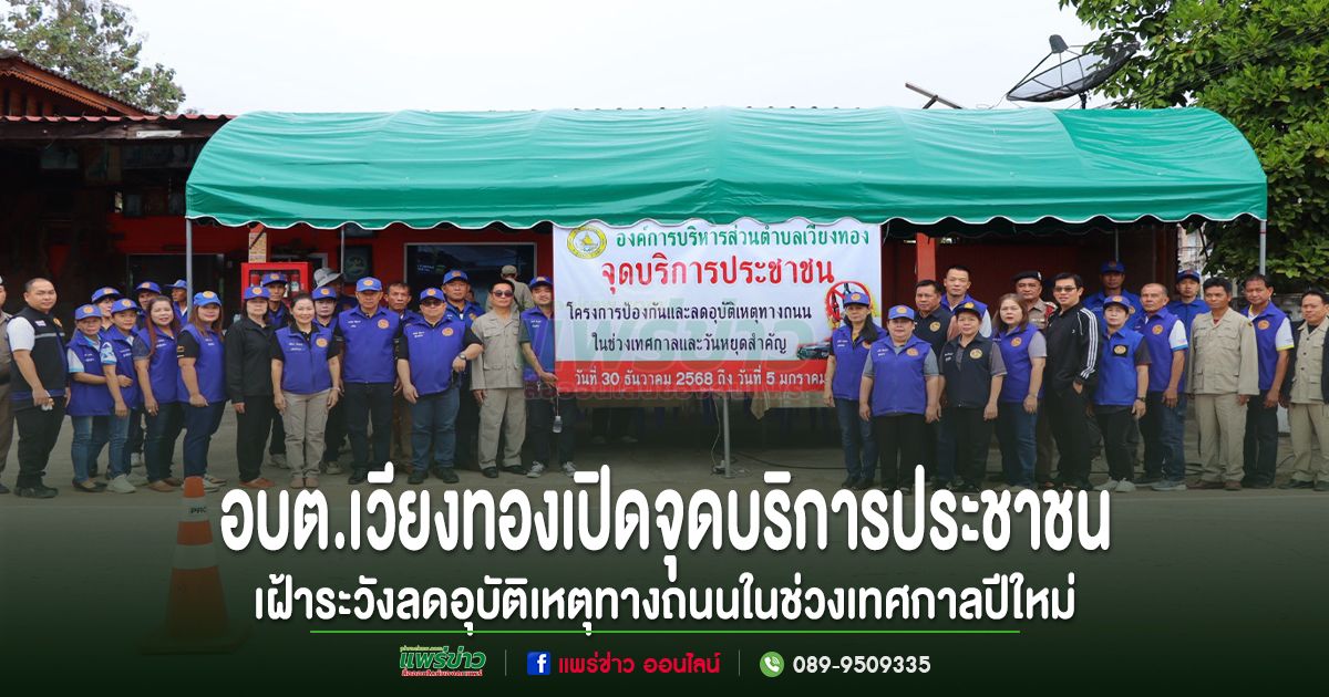 วันที่ 30 ธันวาคม 2568 เวลา 09.00 น. องค์การบริหารส่วนตำบลเวียงทอง นำโดย นายสมยศ ยอดสอน รองปลัดฯ รักษาราชการแทนปลัดฯ ปฎิบัติหน้าที่นายกองค์การบริหารส่วนตําบลเวียงทอง เป็นประธานในการเปิดจุดบริการประชาชนและเฝ้าระวังลดอุบัติเหตุทางถนนในช่วงเทศกาลปีใหม่ พ.ศ. 2569 ระหว่างวันที่ 30 ธันวาคม 2568 ถึงวันที่ 5 มกราคม 2569 เพื่อป้องกัน และลดอุบัติเหตุ ลดการสูญเสียชีวิตและทรัพย์สิน