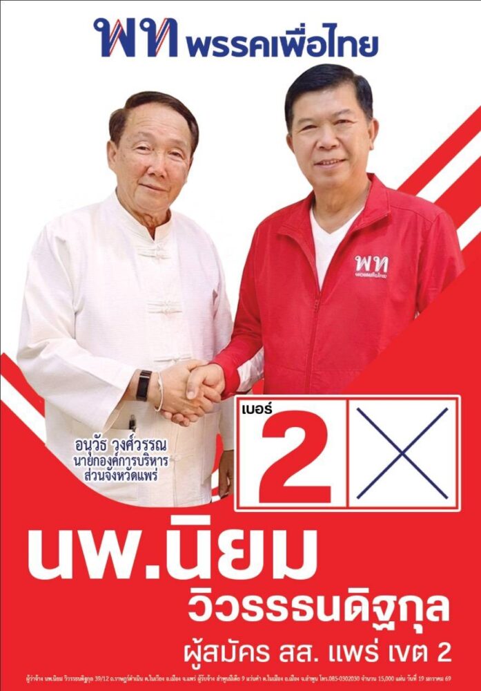 เมื่อวันจันทร์ที่ 19 มกราคม 2569 เวลา 12.00 น. หมออุ๋ย นพ.นิยม วิวรรธนดิฐกุล ผู้สมัครสมาชิกสภาผู้แทนราษฎรจังหวัดแพร่ เขต 2 หมายเลข 2 พรรคเพื่อไทย พร้อมด้วยทีมงาน ลงพื้นที่พบปะเยี่ยมเยือนประชาชนในเขตพื้นที่ เพื่อสอบถามสารทุกข์สุขดิบและรับฟังปัญหาความเป็นอยู่ของประชาชนอย่างใกล้ชิด