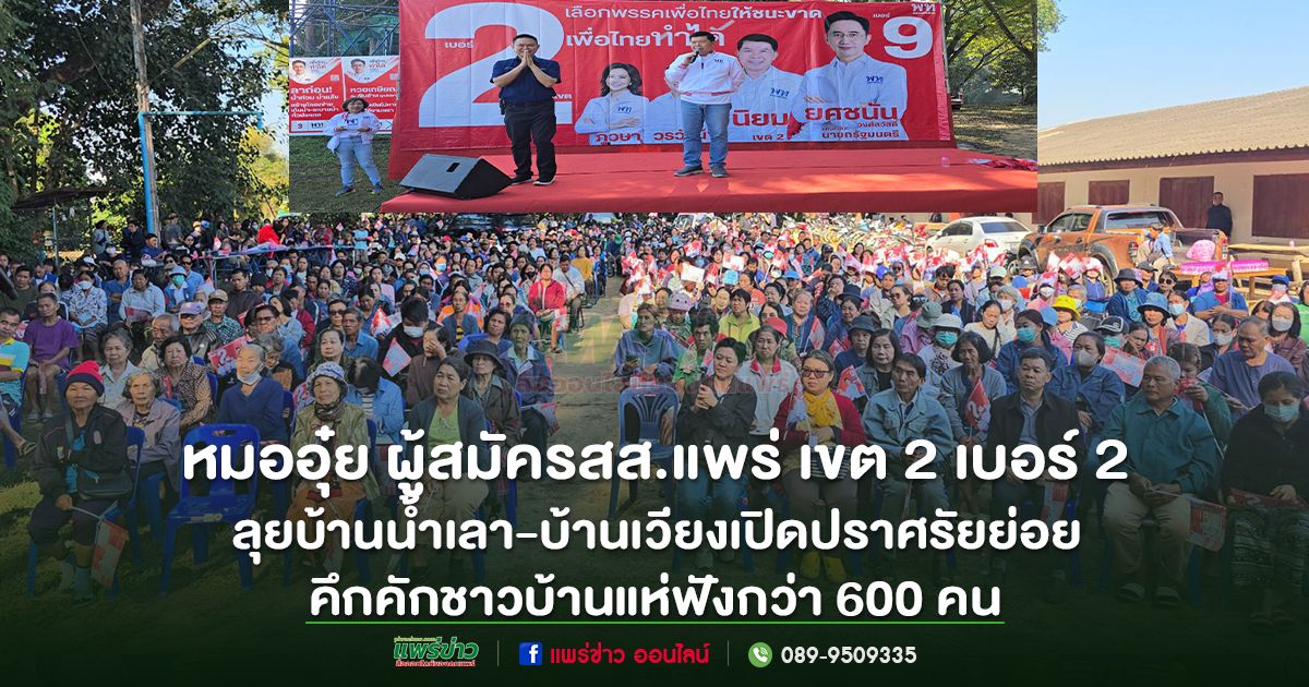 พรรคเพื่อไทยจ.แพร่รุกเข้าทุกพื้นที่อย่างต่อเนื่องโดยเมื่อสายวันที่ 21มกราคม2569เวลา 09.00 น. ณ บ้านน้ำเลาหมู่ที่ 5 ตำบลน้ำเลา อำเภอเมือง จังหวัดแพร่บรรยากาศการเมืองในพื้นที่เป็นไปอย่างคึกคัก หลัง หมออุ๋ยนายแพทย์นิยม วิวรรธนดิฐกุล ผู้สมัครสมาชิกสภาผู้แทนราษฎรจังหวัดแพร่ เขต 2 พรรคเพื่อไทย ลงพื้นที่เปิดเวทีปราศรัยย่อยพบปะพี่น้องประชาชนในเขตตำบลน้ำเลา และตำบลบ้านเวียง