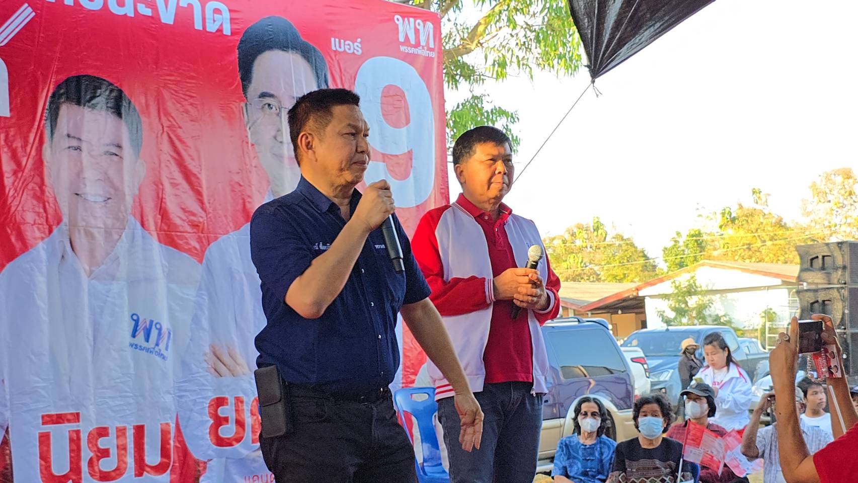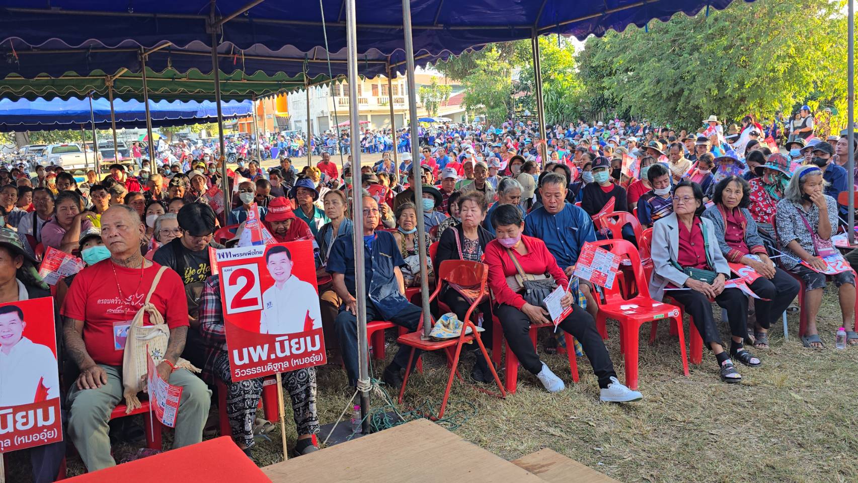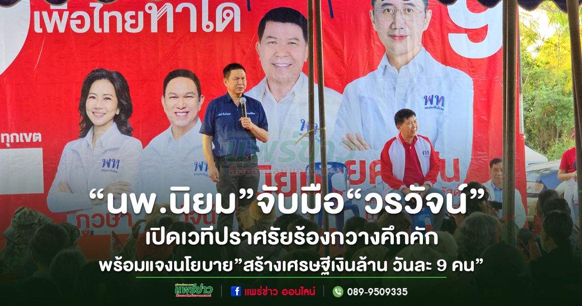 บรรยากาศเวทีปราศรัยพรรคเพื่อไทย ที่ลานตลาดนัดคลองถม ต.ร้องเข็ม อ.ร้องกวาง จ.แพร่ เป็นไปอย่างคึกคัก มีประชาชนมาร่วมรับฟังปราศรัยกันจนเต็มพื้นที่ นพ.นิยม วิวรรธนดิฐกุล หรือ หมออุ๋ย และ นายวรวัจน์ เอื้ออภิญญกุล ผู้สมัคร สส.เบอร์ 2 พรรคเพื่อไทย ขึ้นเวทีชี้แจงนโยบาย และร่วมรับฟังเสียงสะท้อนจากประชาชนในพื้นที่