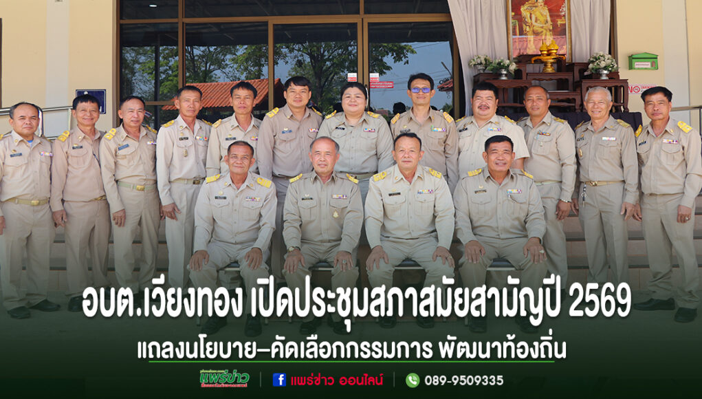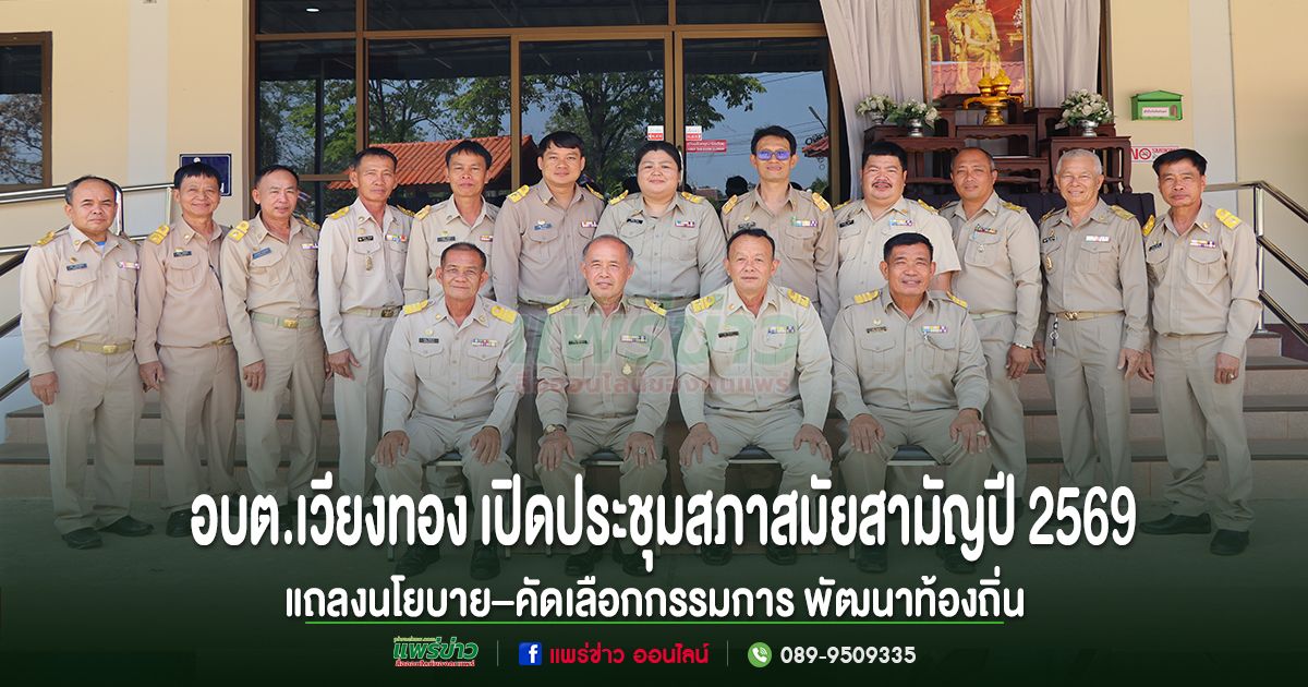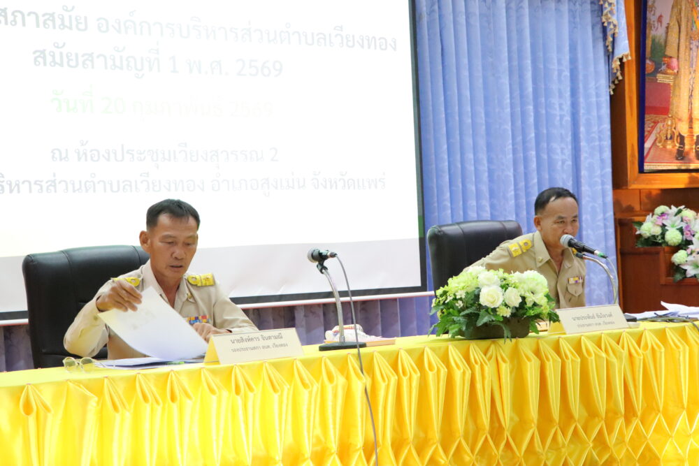 วันที่ 20 กุมภาพันธ์ 2569 เวลา 09.00 น. องค์การบริหารส่วนตำบลเวียงทอง จัดการประชุมสภาองค์การบริหารส่วนตำบลเวียงทอง สมัยสามัญ สมัยที่ 1 ประจำปี พ.ศ.2569 ณ ห้องประชุมเวียงสุวรรณ 2 องค์การบริหารส่วนตำบลเวียงทอง อำเภอสูงเม่น จังหวัด แพร่