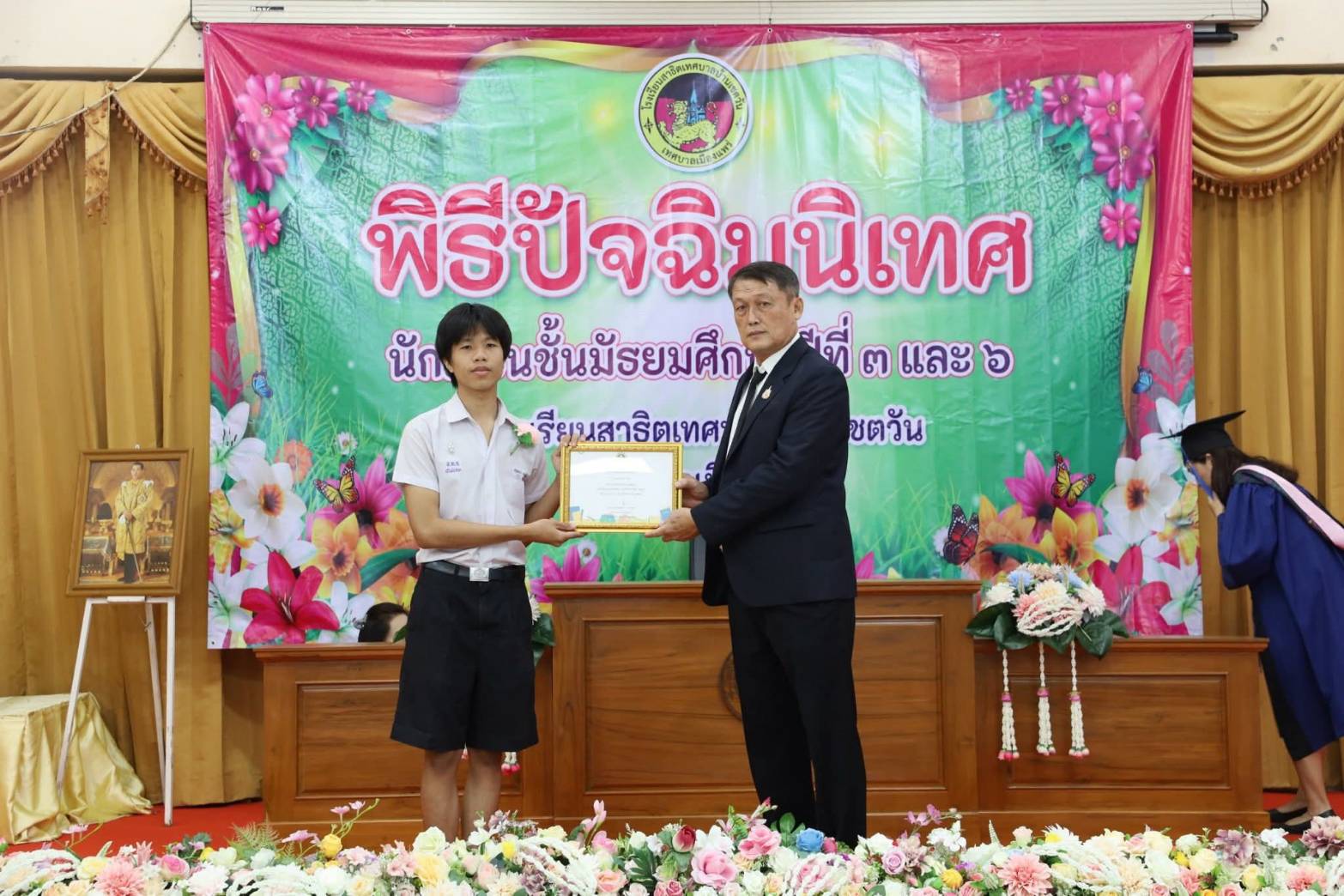 เข้าร่วมกิจกรรมงานปัจฉิมนิเทศและพิธีมอบประกาศนียบัตรแก่นักเรียนที่สำเร็จการศึกษา ระดับชั้นมัธยมศึกษาปีที่ 3 และมัธยมศึกษาปีที่ 6 ประจำปีการศึกษา 2568 ณ ห้องประชุมอาคารลีลาวดี โรงเรียนสาธิตเทศบาลบ้านเชตวัน กองการศึกษาเทศบาลเมืองแพร่โดยมี ดร.เกียรติสุดา กาศเกษม ผอ.รร.สาธิตเทศบาลบ้านเชตวันนำคณะครูให้การต้อนรับ