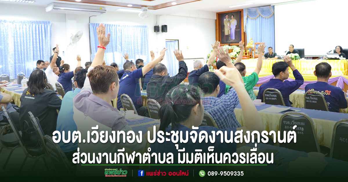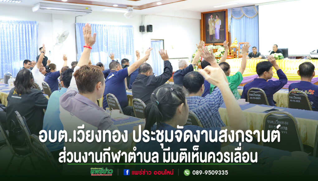 เมื่อวันที่ 13 มีนาคม 2569 นายเสรี เวียงนาค นายกองค์การบริหารส่วนตำบลเวียงทอง พร้อมด้วยคณะผู้บริหาร สมาชิกสภาองค์การบริหารส่วนตำบลเวียงทอง และชมรมกำนัน–ผู้ใหญ่บ้านตำบลเวียงทอง ร่วมประชุมเพื่อพิจารณาแนวทางการดำเนินโครงการแข่งขันกีฬาตำบล และโครงการประเพณีสงกรานต์ รวมถึงกิจกรรมรดน้ำดำหัวผู้สูงอายุและผู้นำชุมชนตำบลเวียงทอง ประจำปี 2569 เพื่อหารือแนวทางการจัดกิจกรรมให้เป็นไปอย่างเหมาะสมและเกิดประโยชน์ต่อประชาชนในพื้นที่