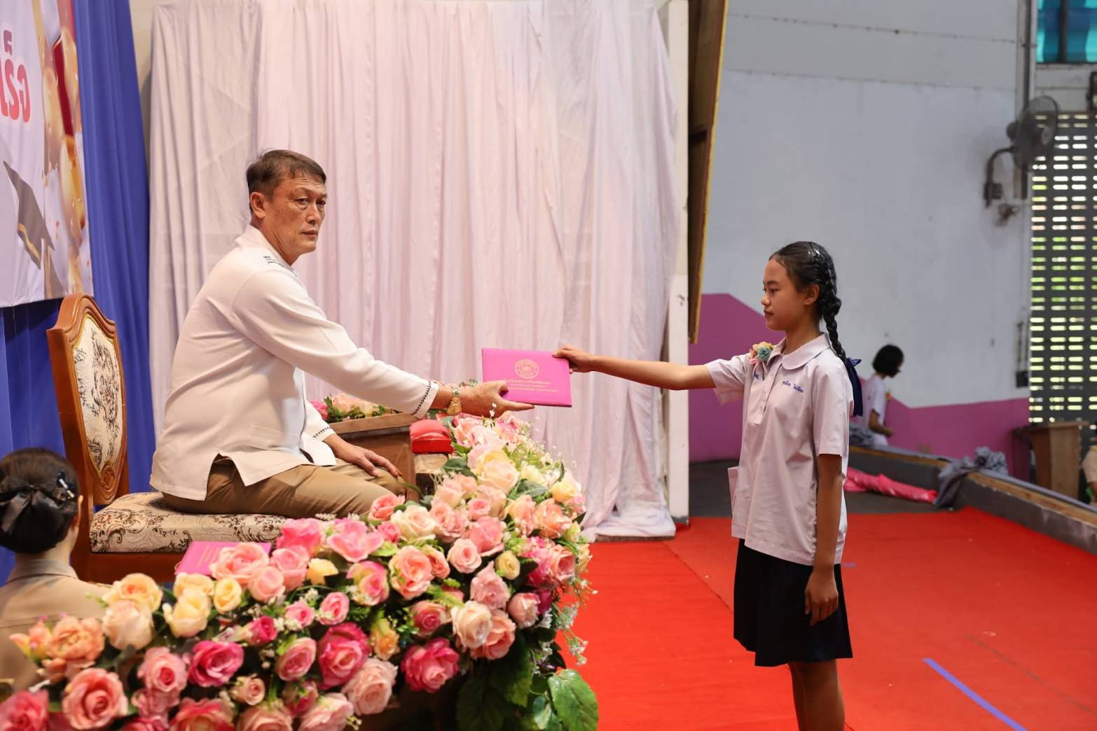 ภายในพิธีประกอบด้วยกิจกรรมการแสดงของนักเรียน การเดินลอดซุ้มธงเทาชมพูเข้าสู่อาคารอเนกประสงค์ การแสดงดนตรีไทย พิธีจุดเทียนบูชาพระรัตนตรัย การมอบประกาศนียบัตรแก่นักเรียน การกล่าวรายงานโดยผู้อำนวยการสถานศึกษา และการกล่าวปัจฉิมโอวาทเพื่อเป็นข้อคิดและกำลังใจให้แก่นักเรียนก่อนก้าวสู่ระดับการศึกษาที่สูงขึ้น
