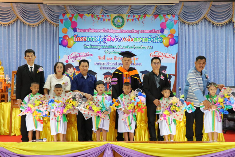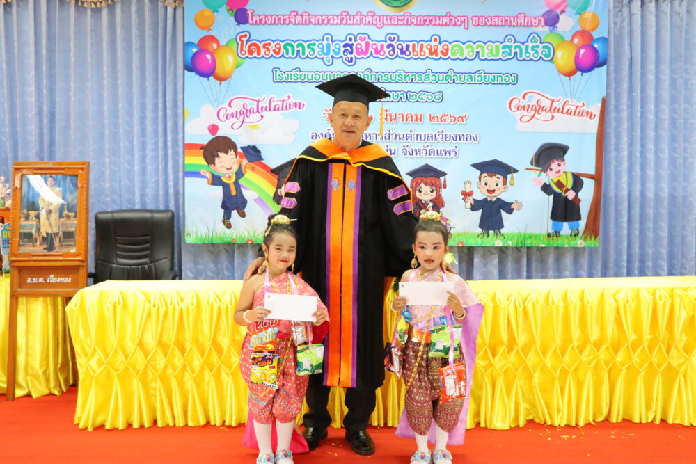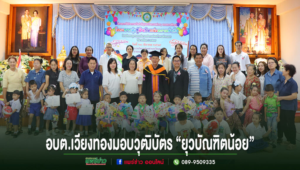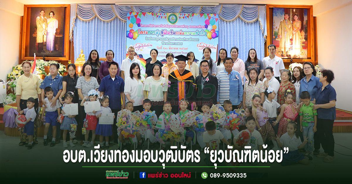 วันที่ 20 มีนาคม 2569 นายเสรี เวียงนาค นายกองค์การบริหารส่วนตำบลเวียงทอง เป็นประธานในพิธีมอบวุฒิบัตร “ยุวบัณฑิตน้อย” ให้แก่นักเรียนที่สำเร็จการศึกษาระดับชั้นปฐมวัย ตามโครงการจัดกิจกรรมวันสำคัญและกิจกรรมวันต่าง ๆ ของสถานศึกษา (โครงการมุ่งสู่ฝันวันแห่งความสำเร็จ) ของโรงเรียนอนุบาลองค์การบริหารส่วนตำบลเวียงทอง ประจำปีการศึกษา 2568 โดยมีวัตถุประสงค์เพื่อสร้างแรงจูงใจใฝ่สัมฤทธิ์ และปลูกฝังให้นักเรียนมีความมุ่งมั่นตั้งใจศึกษาต่อไปให้ประสบความสำเร็จในอนาคต