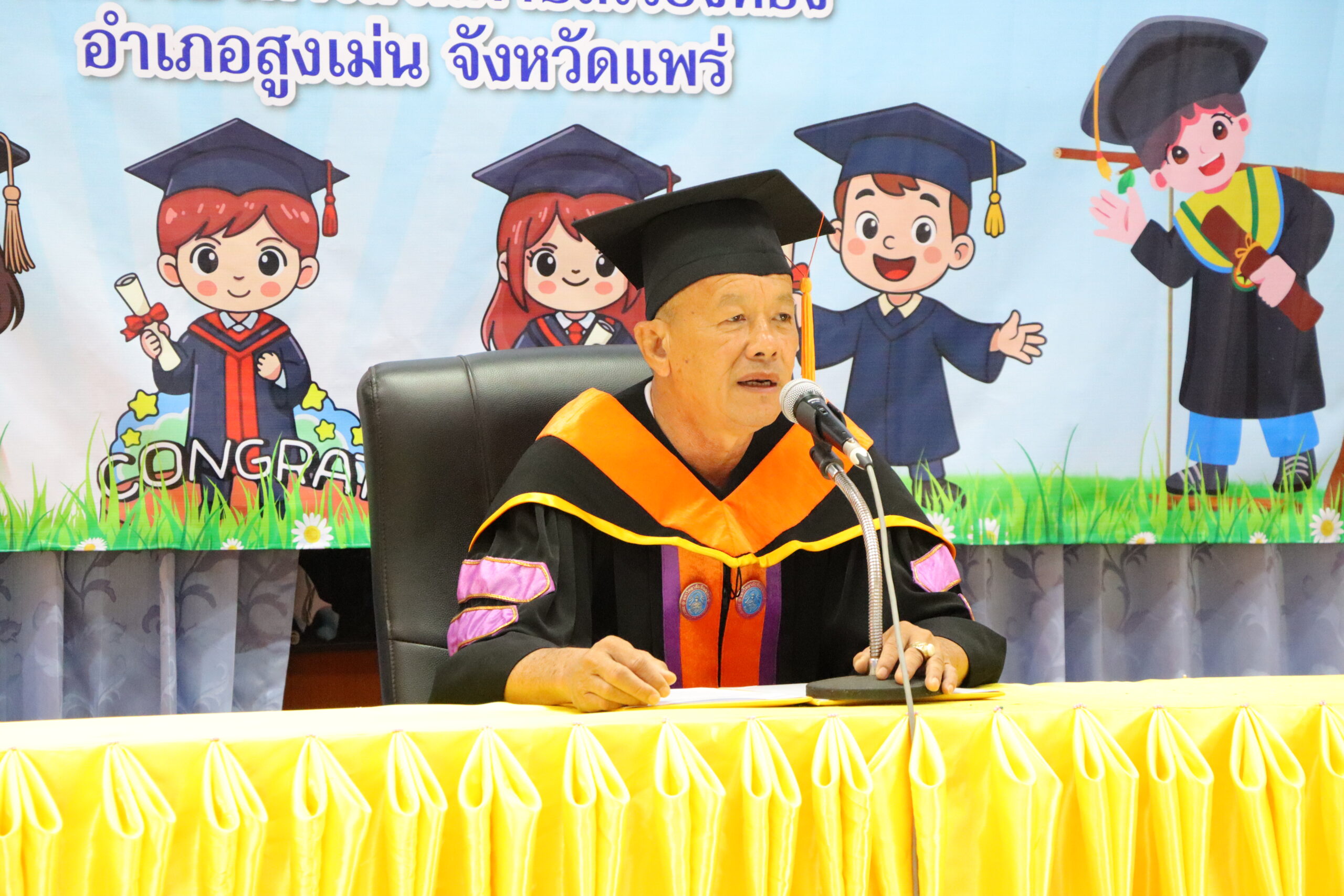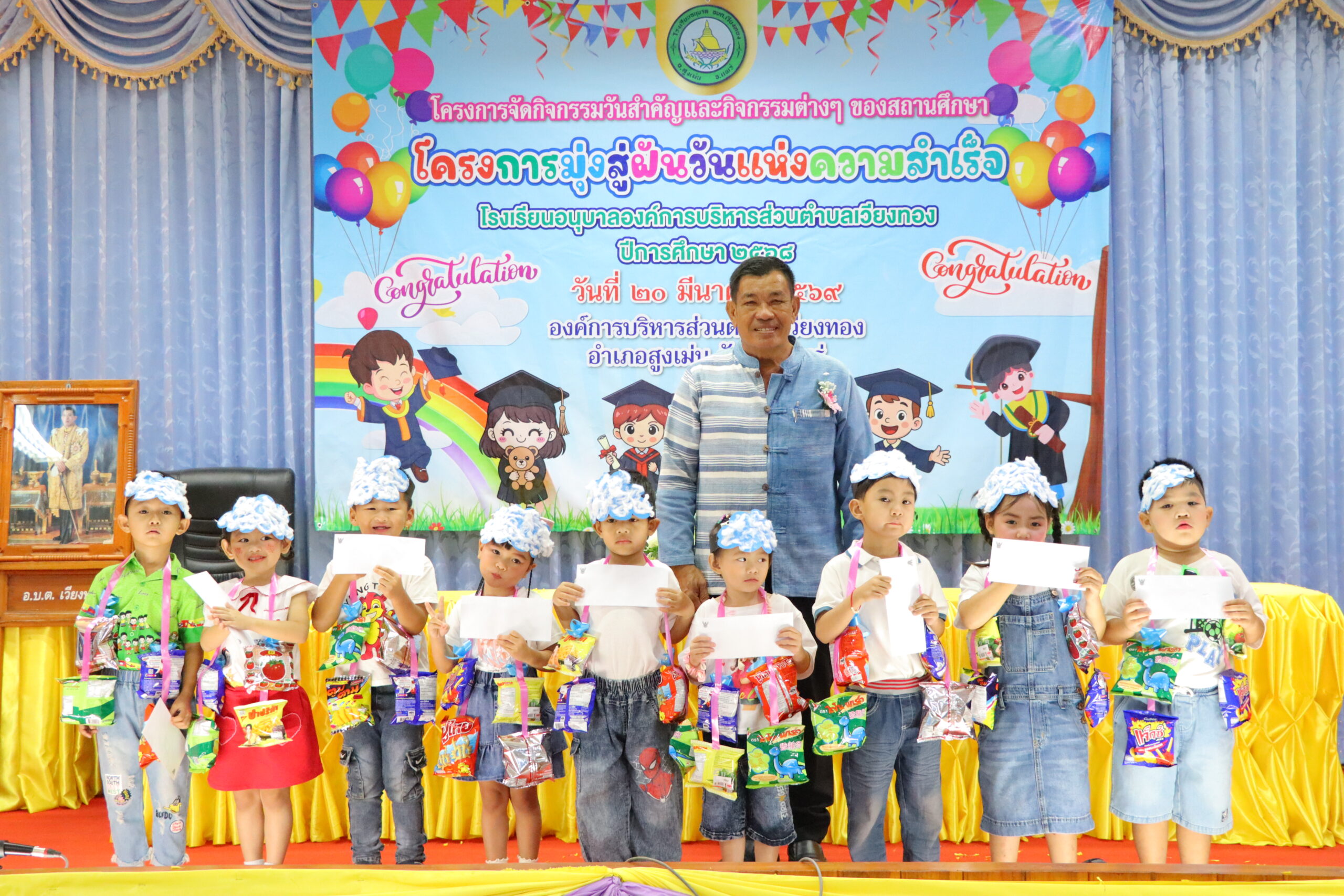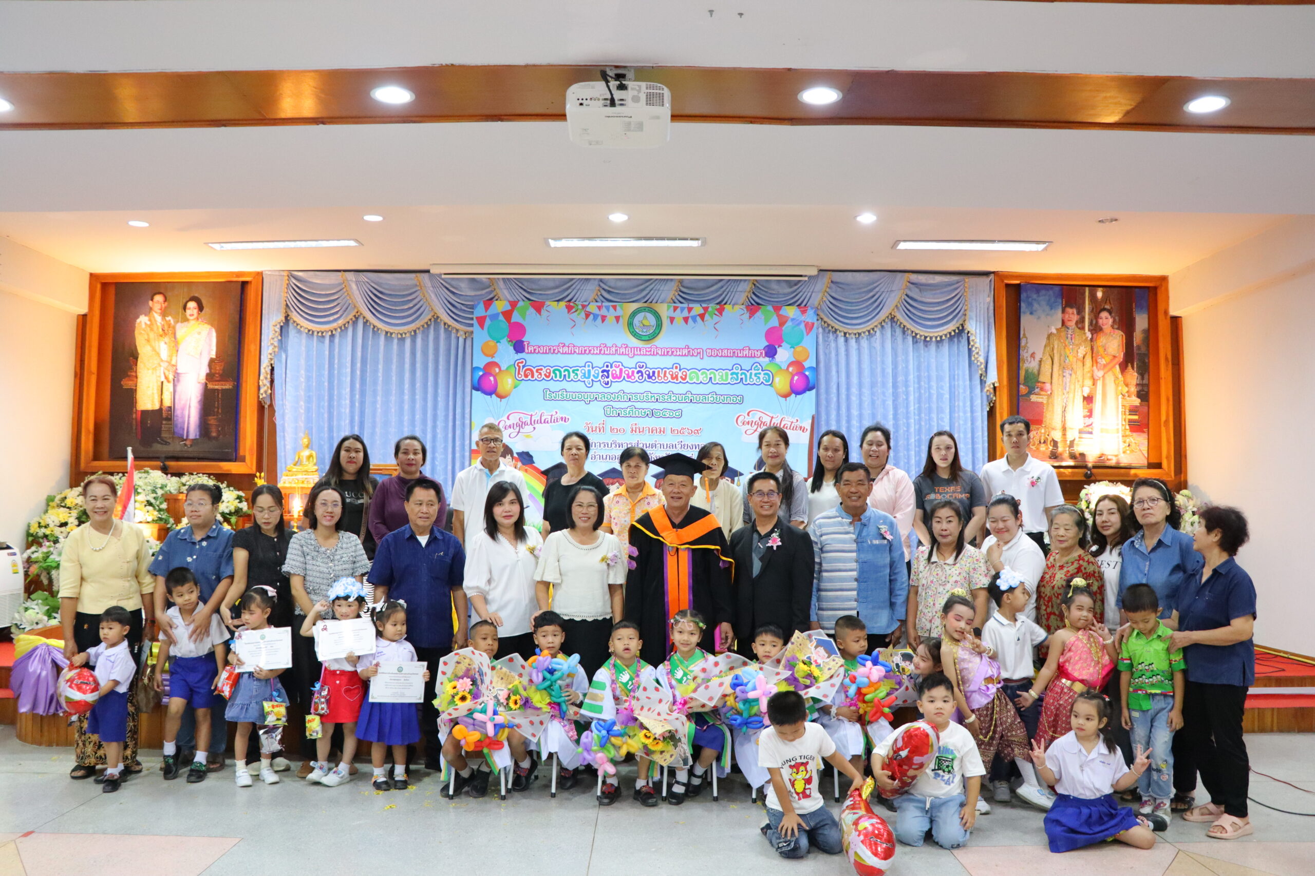 วันที่ 20 มีนาคม 2569 นายเสรี เวียงนาค นายกองค์การบริหารส่วนตำบลเวียงทอง เป็นประธานในพิธีมอบวุฒิบัตร “ยุวบัณฑิตน้อย” ให้แก่นักเรียนที่สำเร็จการศึกษาระดับชั้นปฐมวัย ตามโครงการจัดกิจกรรมวันสำคัญและกิจกรรมวันต่าง ๆ ของสถานศึกษา (โครงการมุ่งสู่ฝันวันแห่งความสำเร็จ) ของโรงเรียนอนุบาลองค์การบริหารส่วนตำบลเวียงทอง ประจำปีการศึกษา 2568 โดยมีวัตถุประสงค์เพื่อสร้างแรงจูงใจใฝ่สัมฤทธิ์ และปลูกฝังให้นักเรียนมีความมุ่งมั่นตั้งใจศึกษาต่อไปให้ประสบความสำเร็จในอนาคต