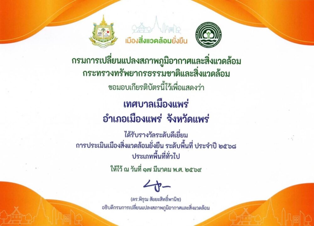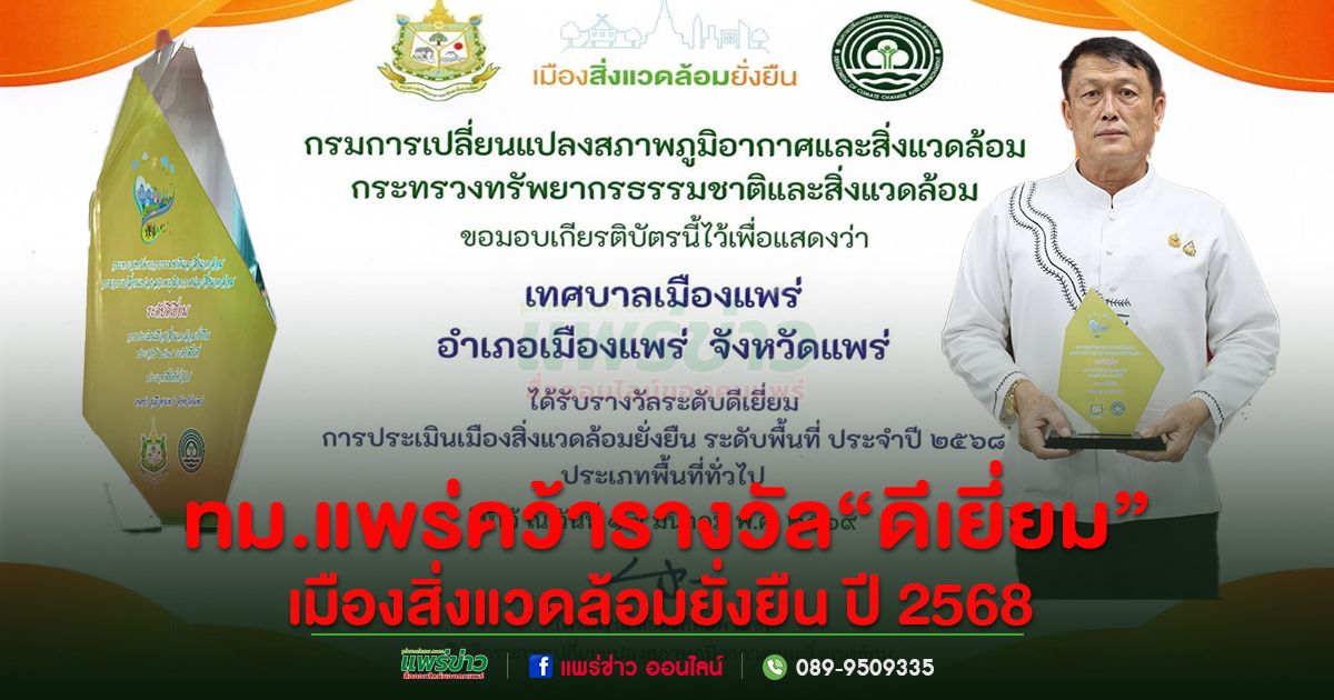 เมื่อวันที่ 17 มีนาคม 2569 เทศบาลเมืองแพร่ ได้รับรางวัลระดับ “ดีเยี่ยม” จากการประเมินเมืองสิ่งแวดล้อมยั่งยืน ระดับพื้นที่ ประจำปี 2568 ประเภทพื้นที่ทั่วไป