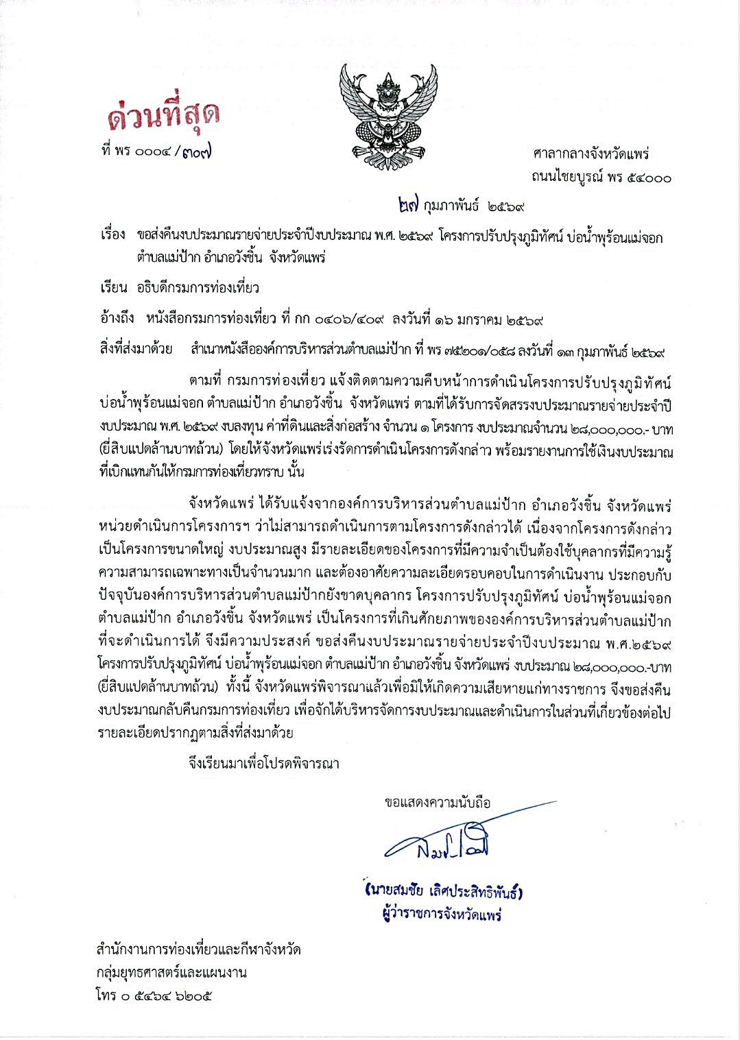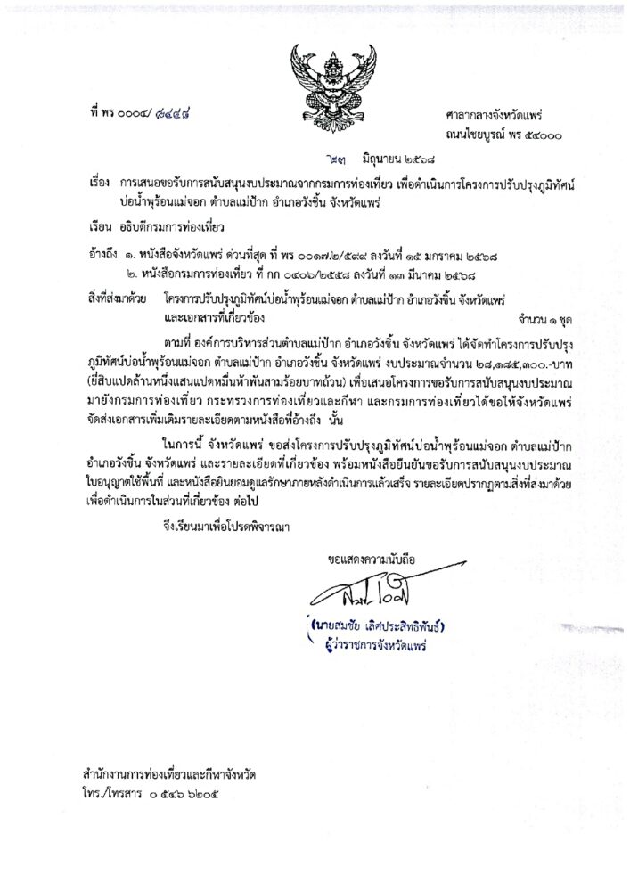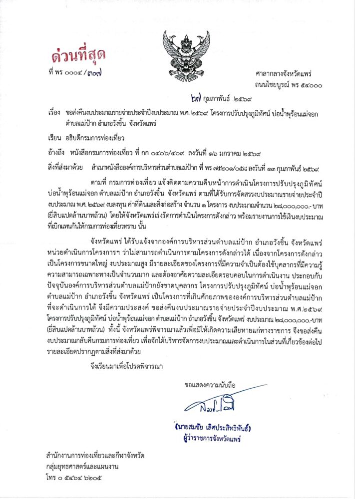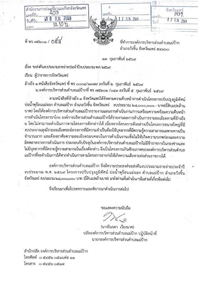 เมื่อเวลา 11.00 น. วันที่ 31 มี.ค. 69 ตัวแทนภาคประชาชนอำเภอวังชิ้น จ.แพร่ เดินทางไปที่ชั้น 5 ศาลากลางจังหวัดแพร่ เพื่อขอพบ สมชัย เลิศประสิทธิพันธ์ ผวจ.แพร่ กรณีที่ทราบข่าวว่า องค์การบริหารส่วนตำบลแม่ป้าก ทำหนังสือขอคืนงบประมาณรายจ่ายประจำปีงบประมาณ พ.ศ. 2569 โครงการปรับปรุงภูมิทัศน์ บ่อน้ำตำบลแม่ป้าก อำเภอวังชิ้น จังหวัดแพร่ งบประมาณ 28,000,000 บาท (ยี่สิบแปดล้านบาทถ้วน) โดยขอให้ท่านผู้ว่าฯแพร่ ระงับการตามรับคืนงบประมาณดังกล่าว เพราะเสียดายและทำให้ อ.วังชิ้น สูญเสียโอกาสในการพัฒนาแหล่งท่องเที่ยว และไม่รู้ว่าจะได้งบประมาณแบบนี้มาอีกเมื่อไหร่ จึงได้เดินทางมาพบผู้ว่าฯแพร่ ในวันนี้