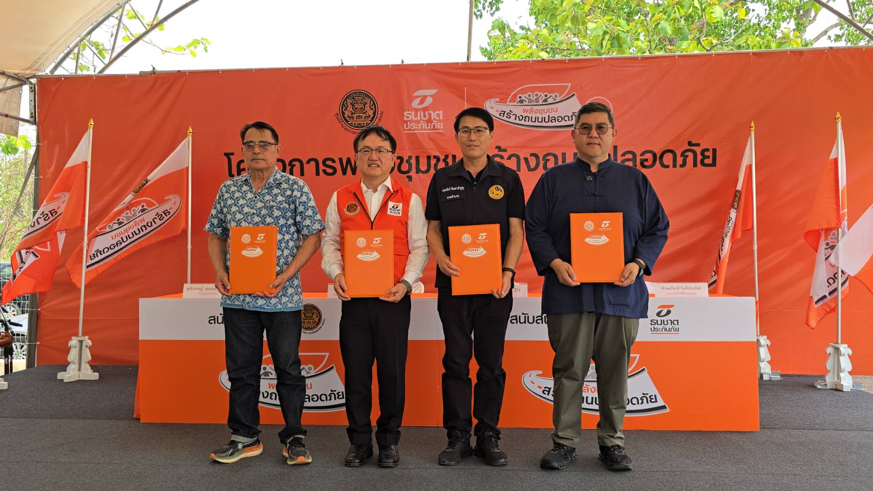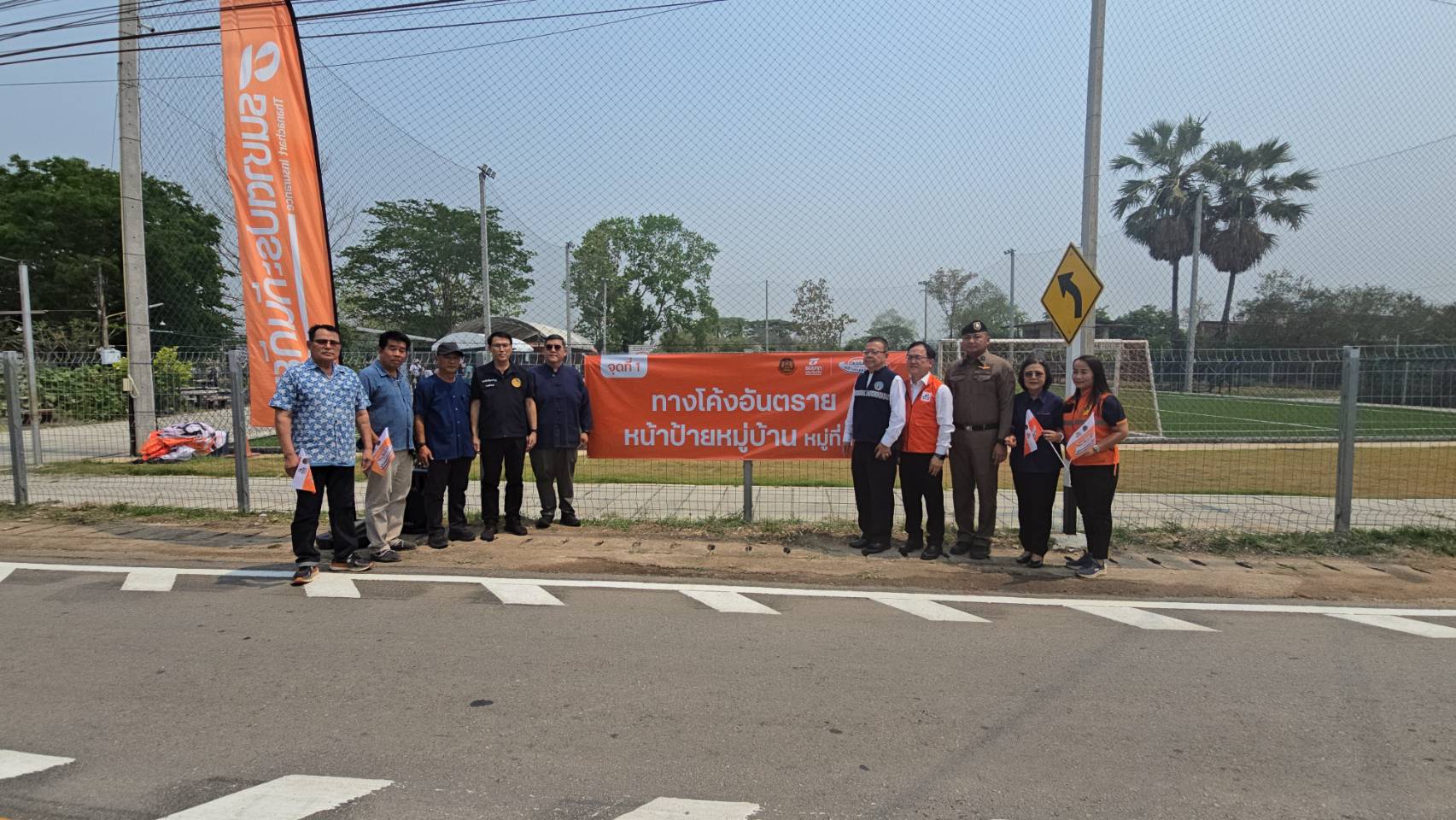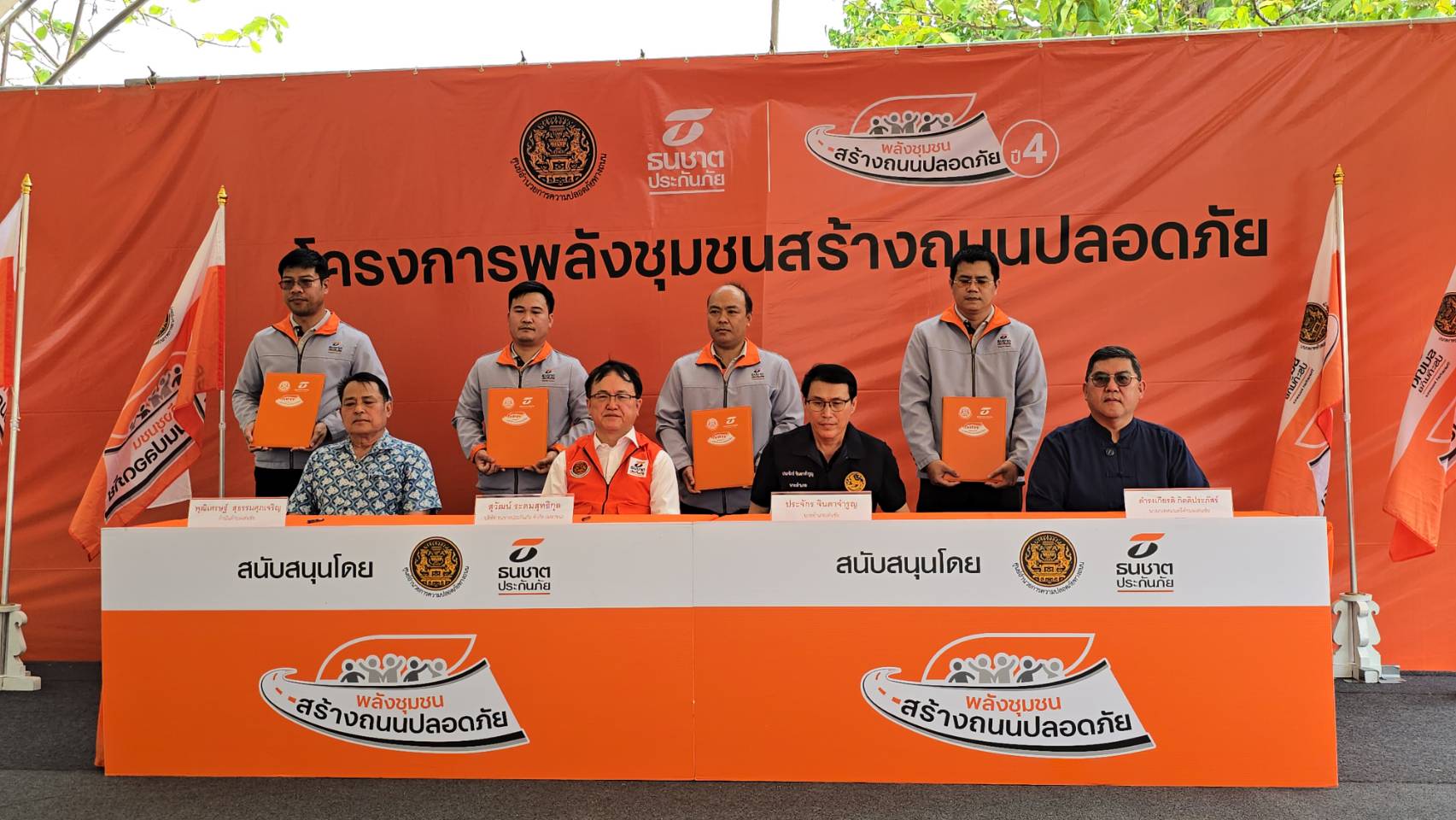 นอกจากนี้ ธนชาตประกันภัย ยังได้จัดพิธีส่งมอบธง “พลังชุมชนสร้างถนนปลอดภัย” ให้กับเทศบาลตำบลเด่นชัย เพื่อแสดงพลังความพร้อมและความร่วมมือระหว่างภาครัฐและเอกชน รวมถึงภาคประชาชนในการขับเคลื่อนความปลอดภัยทางถนนให้กับชุมชน จากนั้นได้ร่วมกันติดตั้งอุปกรณ์ลดจุดเสี่ยงบนท้องถนน พร้อมอาณัติสัญญาณจราจร ซึ่งเป็นนวัตกรรมที่จะช่วยลดการเกิดอุบัติเหตุทางถนนบริเวณทางโค้งหน้าป้ายหมู่บ้านปากพวกได้อย่างมีประสิทธิภาพ โดยมีตัวแทนภาคีเครือข่ายและประชาชนในพื้นที่ร่วมกิจกรรมจำนวนมาก