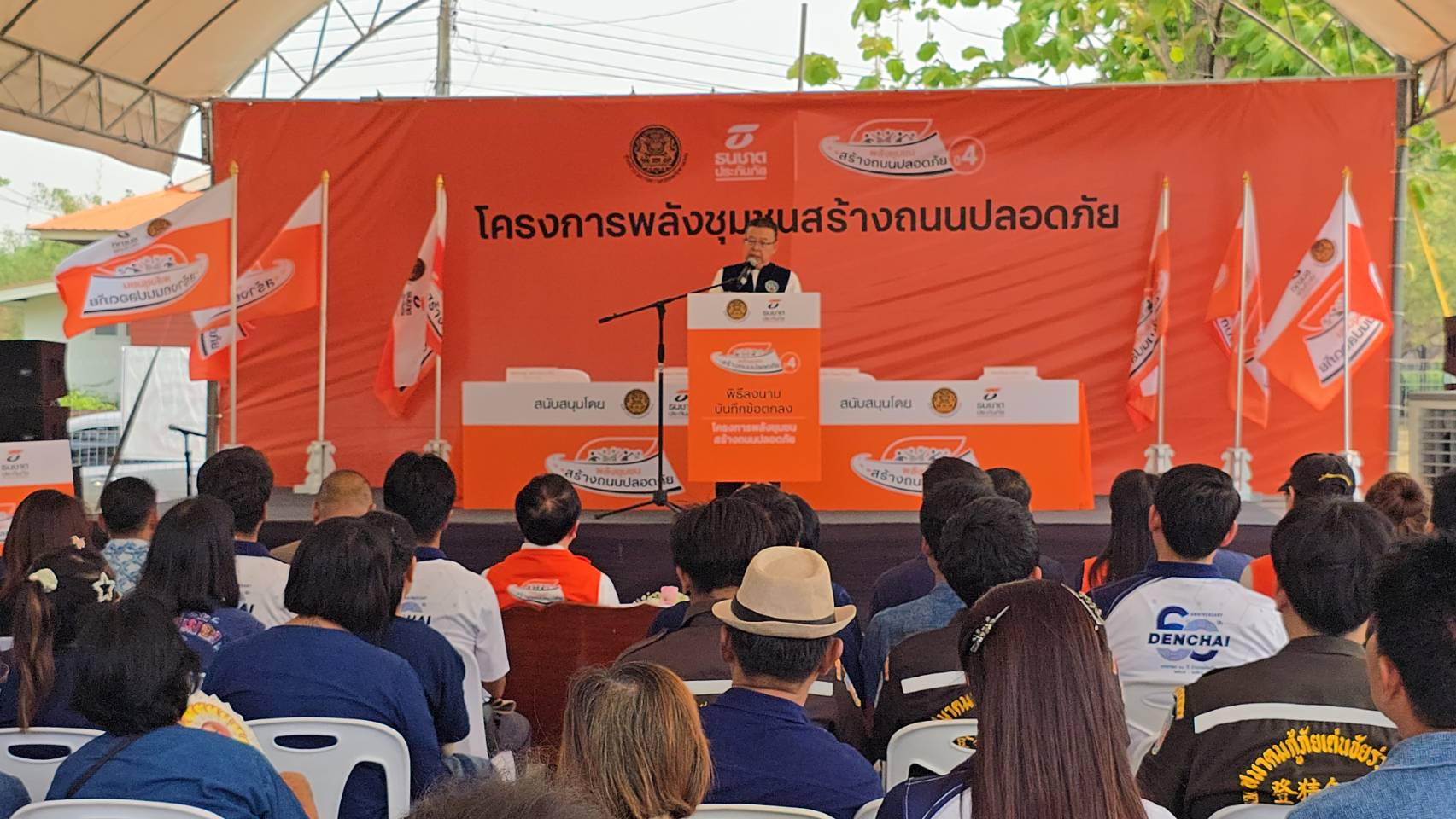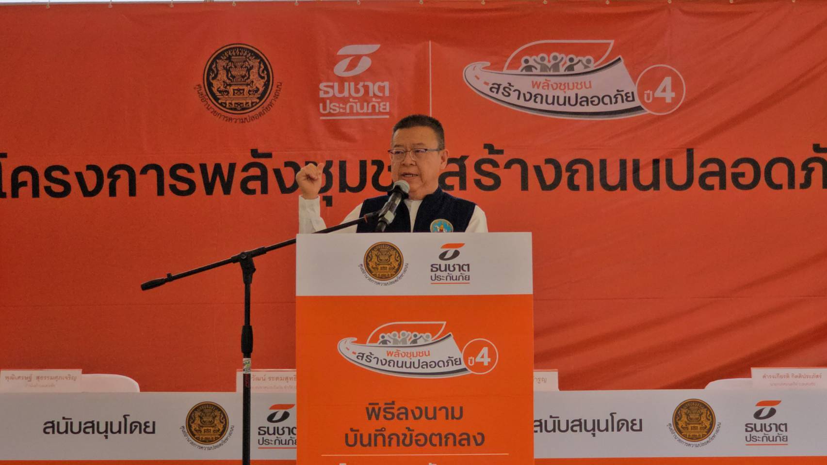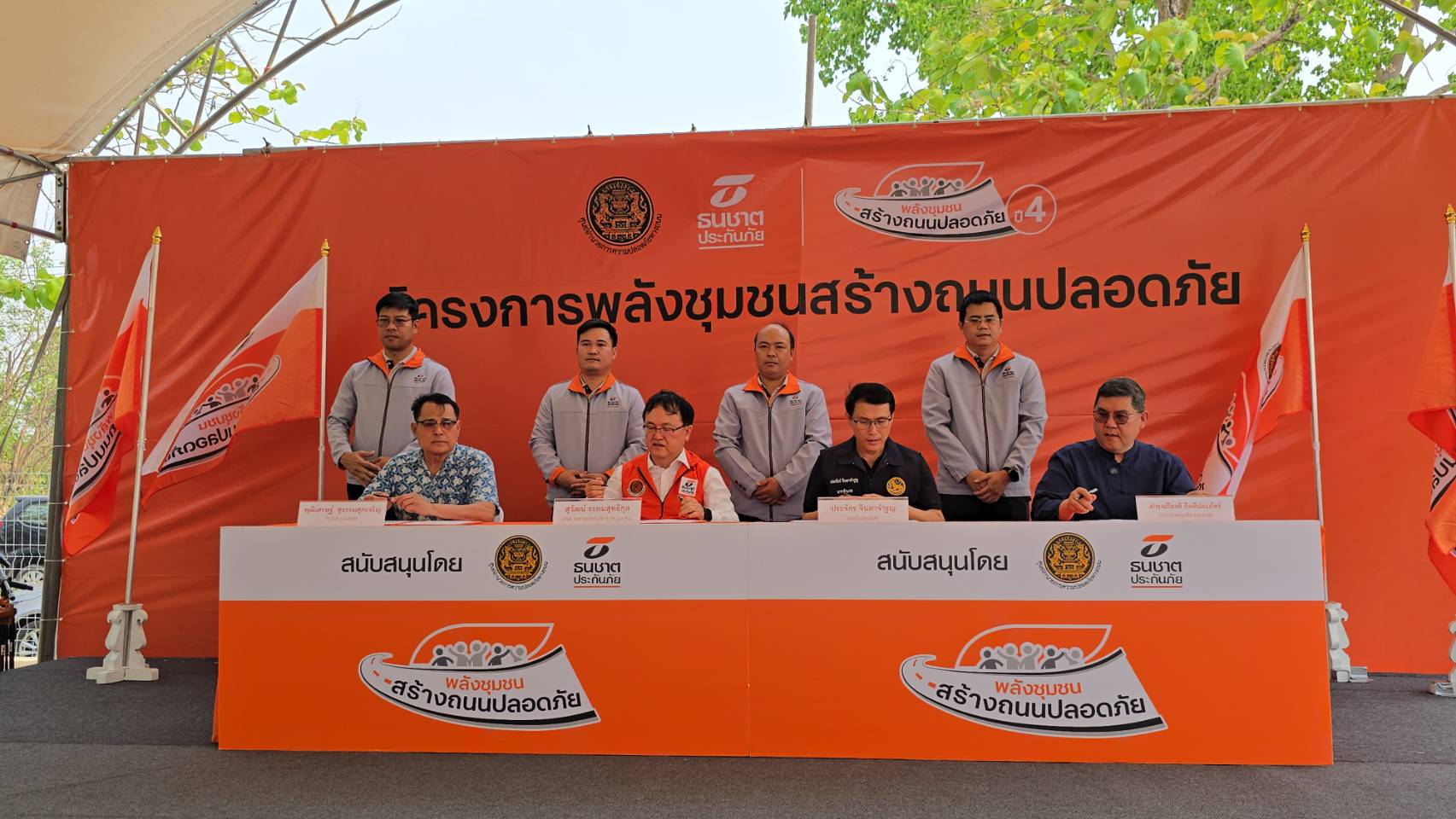 นอกจากนี้ ธนชาตประกันภัย ยังได้จัดพิธีส่งมอบธง “พลังชุมชนสร้างถนนปลอดภัย” ให้กับเทศบาลตำบลเด่นชัย เพื่อแสดงพลังความพร้อมและความร่วมมือระหว่างภาครัฐและเอกชน รวมถึงภาคประชาชนในการขับเคลื่อนความปลอดภัยทางถนนให้กับชุมชน จากนั้นได้ร่วมกันติดตั้งอุปกรณ์ลดจุดเสี่ยงบนท้องถนน พร้อมอาณัติสัญญาณจราจร ซึ่งเป็นนวัตกรรมที่จะช่วยลดการเกิดอุบัติเหตุทางถนนบริเวณทางโค้งหน้าป้ายหมู่บ้านปากพวกได้อย่างมีประสิทธิภาพ โดยมีตัวแทนภาคีเครือข่ายและประชาชนในพื้นที่ร่วมกิจกรรมจำนวนมาก