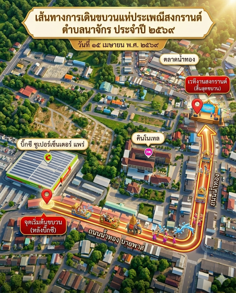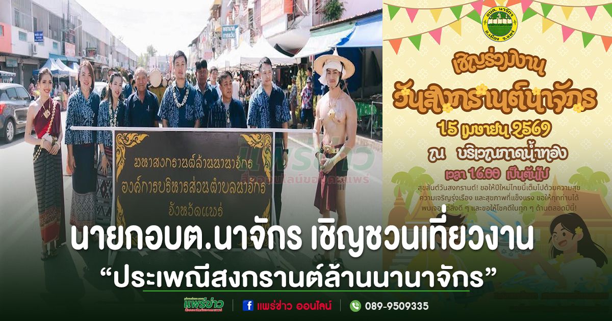 องค์การบริหารส่วนตำบลนาจักร ขอเชิญชวนประชาชนและนักท่องเที่ยวร่วมงาน “ประเพณีสงกรานต์ล้านนานาจักร” ประจำปี 2569 ซึ่งกำหนดจัดขึ้นในวันพุธที่ 15 เมษายน 2569 ณ บริเวณ กาดน้ำทอง โดยกิจกรรมเริ่มตั้งแต่เวลา 16.00 น. เป็นต้นไป