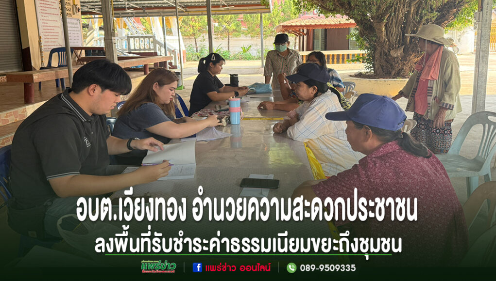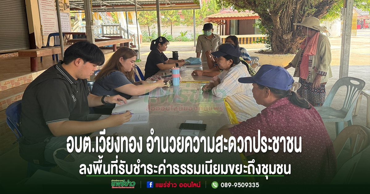 วันที่ 28 เมษายน 2569 งานจัดเก็บรายได้ กองคลัง องค์การบริหารส่วนตำบลเวียงทอง ลงพื้นที่ให้บริการรับชำระค่าธรรมเนียมขยะมูลฝอย ประจำปี พ.ศ. 2569 เพื่ออำนวยความสะดวกให้กับประชาชน สามารถชำระค่าธรรมเนียมได้ใกล้บ้าน สะดวก รวดเร็ว และช่วยประหยัดเวลาในการเดินทาง