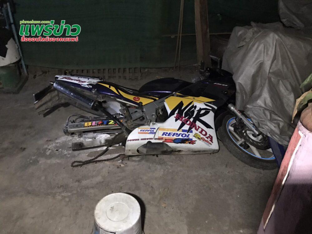 จากการตรวจสอบภายในบ้านพบว่ามีรถ จยย.ฮอนด้า NSR 150 สีคราม-ขาว จอดล้มตะแคงข้าง ล้อหลังหายไป 1 ล้อ โดยมี จยย. อีก 2 คัน คลุมผ้าจอดอยู่ข้างๆ จากการตรวจสอบพบว่า มีถังสีที่คนร้ายใช้นั่งขณะแกะล้อรถ จยย. อย่างสบายใจ ตั้งอยู่ข้างรถ และมีร่องรอยปีนหนีออกไปข้างรั้วติดทุ่งนา จนยอดไม้ที่อยู่ข้างรั้วเป็นรอยเหี่ยวชัดเจน