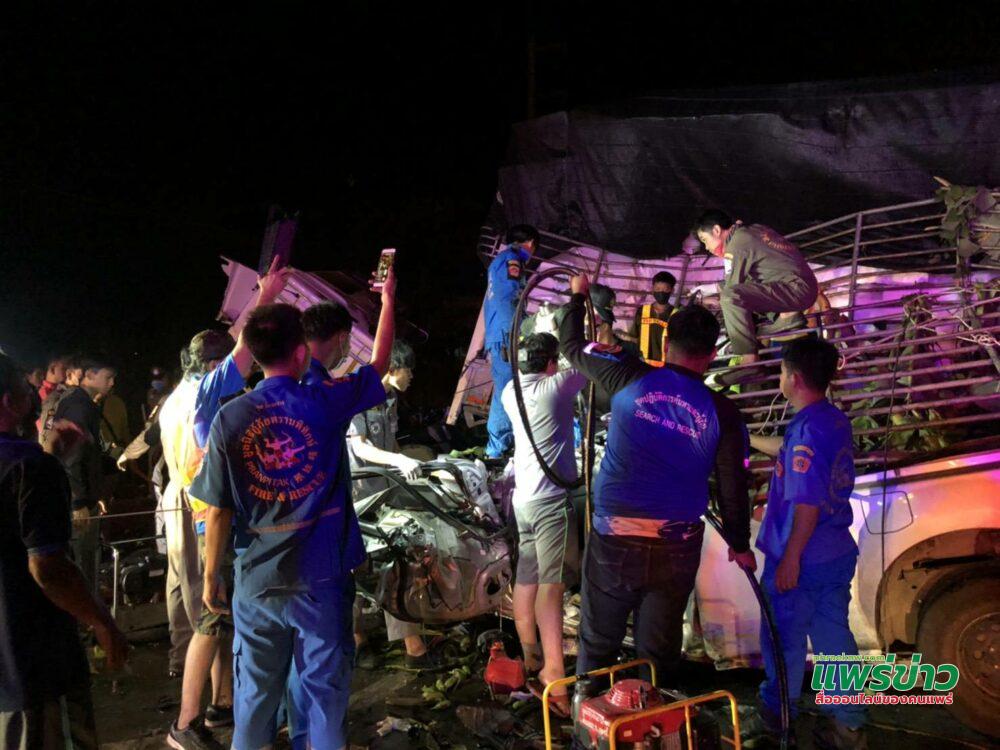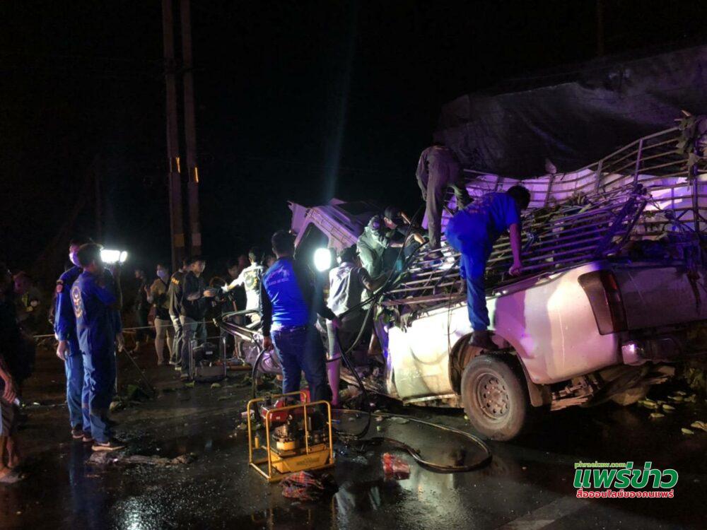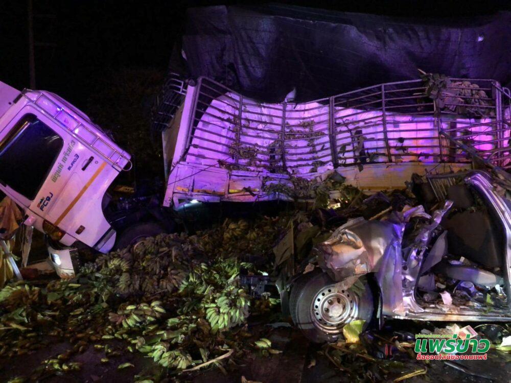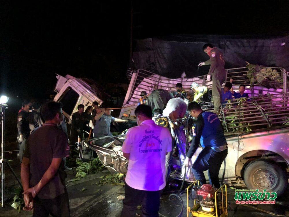 ……….เมื่อไปถึงที่เกิดเหตุพบรถกระบะ โตโยต้า วีโก้ สีบรอนซ์เงิน หมายเลขทะเบียน ผข 8789 เชียงราย บรรทุกกล้วยเต็มคันรถ สภาพด้านหน้าพังยับเยิน มีผู้เสียชีวิตติดอยู่ภายใน เจ้าหน้าที่กู้ภัยต้องระดมกำลังในการทำงานกว่าชั่วโมง ใช้เครื่องตัดถ่างนำศพผู้เสียชีวิตที่ติดอยู่ในรถทราบชื่อในเวลาต่อมา นายอุดม ริยะอุด อายุ 52 ปี อยู่บ้านเลขที่ 41/3 ม.3 ต.ห้วยซ้อ อ.เชียงของ จ.เชียงราย ใกล้กันพบรถบรรทุกหกล้อ ทะเบียนหมายเลข 70-9942 เชียงใหม่ บรรทุกกล่องโฟมจอดขวางถนนอยู่ สภาพถูกชนกลางลำ มีผู้ได้รับบาดเจ็บ 1 คน ทราบชื่อคือ นายวุฒิพงษ์ มหาครอง อายุ 31 ปี อยู่บ้านเลขที่ 236 ม.6 ต.ในเวียง อ.ฝาง จ.เชียงใหม่ ได้รับบาดเจ็บตามลำตัวหลายแห่ง เจ้าหน้าที่กู้ภัยนำตัวส่งรักษาตัว ที่ ร.พ.แพร่