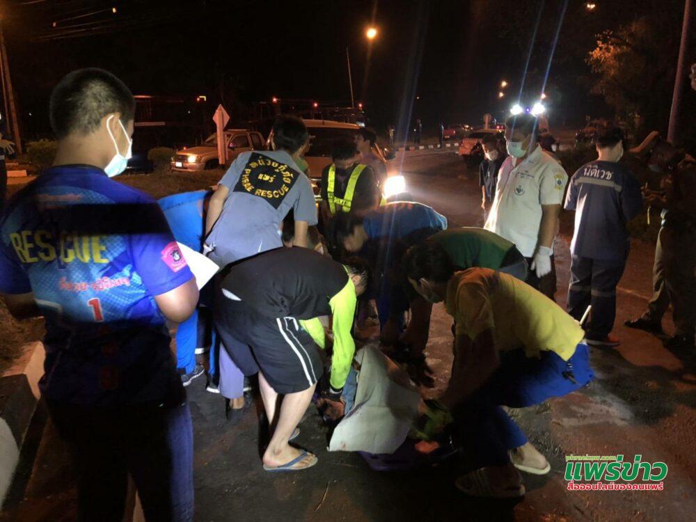 ………….หลังรับแจ้งจึงรายงานให้ พ.ต.อ.นรินทร์ วรรณมณี ผกก.สภ.เมืองแพร่ทราบและรุดไปที่เกิดเหตุร่วมกับ สายตรวจตำบลแม่หล่าย เจ้าหน้าที่กู้ภัยสมาคมอาสาสมัครกู้ภัยจังหวัดแพร่ กู้ชีพเมืองชัยเทศบาลตำบลแม่หล่ายพร้อมอุปกรณ์ตัดถ่าง ร.ต.ท.อิทธิยา นาคมอญ รองสว.สอบสวน สภ.เมืองแพร่ ได้ประสานกู้ภัยจากมูลนิธิกู้ภัยพรานพิทักษ์หนองม่วงไข่ สมาคมอาสาสมัครกู้ภัยจังหวัดแพร่ มูลนิธิกู้ภัยพรานพิทักษ์จุดร้องกวาง