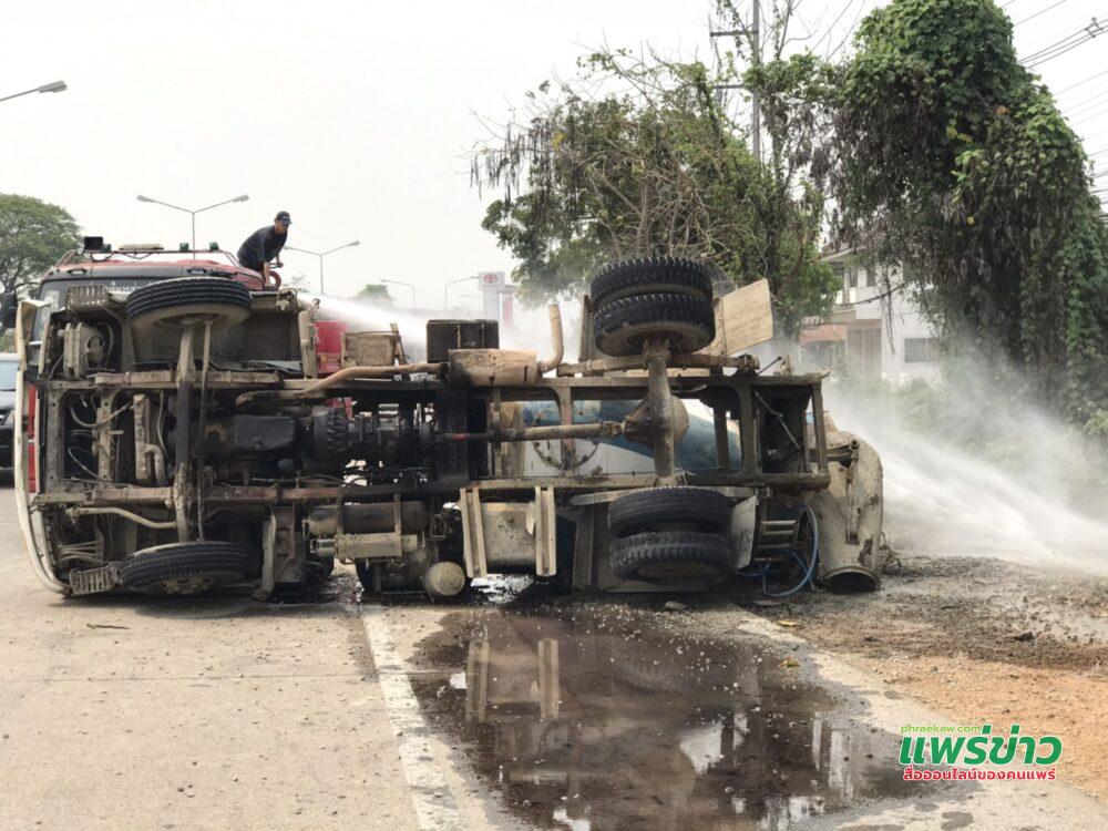 เมื่อเวลา 11.00 น. วันที่ 17 มี.ค.64 ศูนย์วิทยุ สภ.สูงเม่น รับแจ้งเหตุมีรถบรรทุกโม่ปูนสำเร็จรูปคว่ำ บริเวณถนนยันตรกิจโกศลเลนขาขึ้น ปากทางบ้านแม่สายดอนทัน ก่อนถึงร้านลาบหนานเนียง มีผู้ยาดเจ็บ จึงประสาน ร.ต.ต.สถิตย์ ศรีใจวงศ์ สายตรวจ ต.ร่องกาศ ตรวจสอบเหตุ