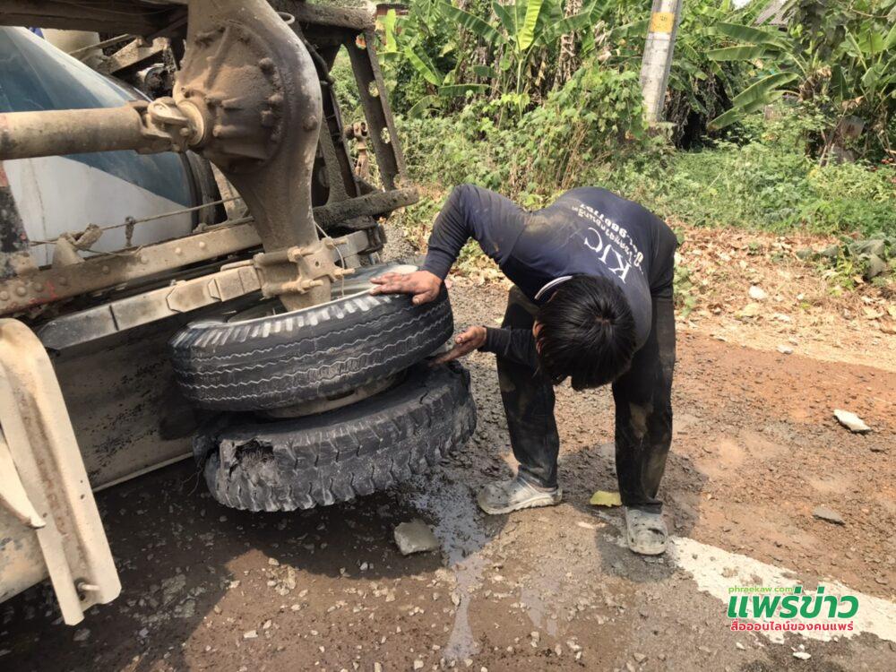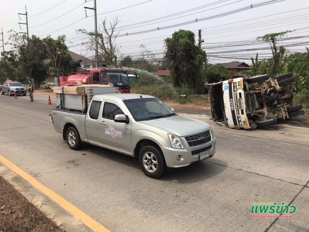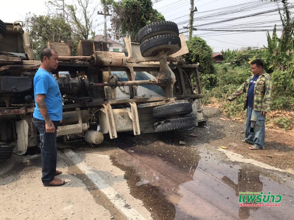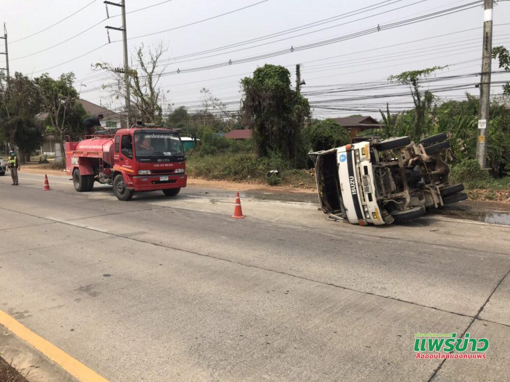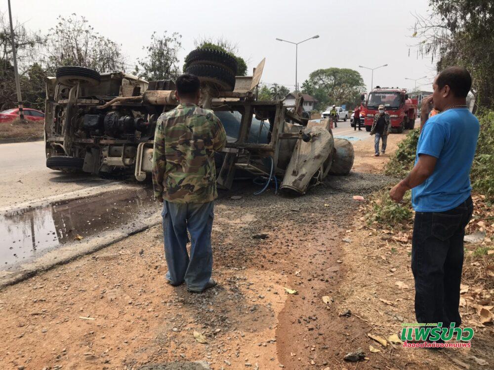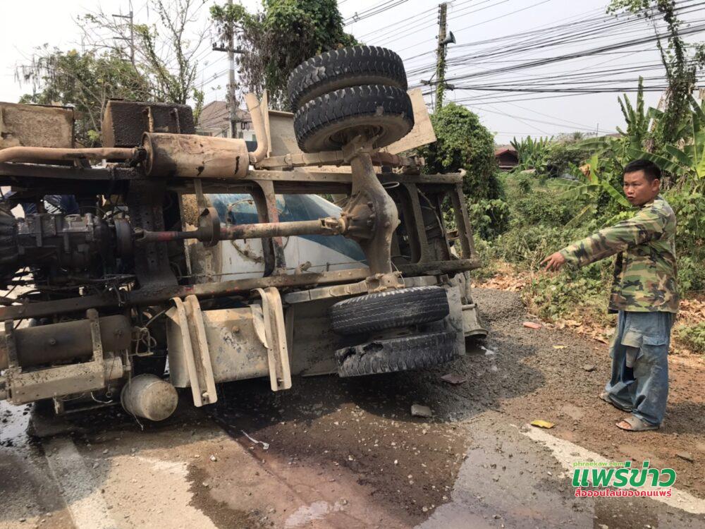 ……….พบมีรถโม่ปูน ยี่ห้อ อีซูซุ 6 ล้อ ทะเบียน 80-6508 แพร่ คว่ำตะแคงข้าง มีปูนสำเร็จรูป ไหลนองจ้างไหล่ทาง มีน้ำและน้ำมันรถไหลนองตามพื้นถนน พบผู้บาดเจ็บเป็นคนขับรถ นายสมศักดิ์ หรือ หมี คำฝาย อายุ 45 ปี บ้านแพะโรงสูบ อ.เด่นชัย เป็นคนขับรถ บาดเจ็บหลังมีอาการปวด จึงได้ประสานหน่วยกู้ภัยสูงเม่น นำส่ง รักษาที่ รพ.สูงเม่น