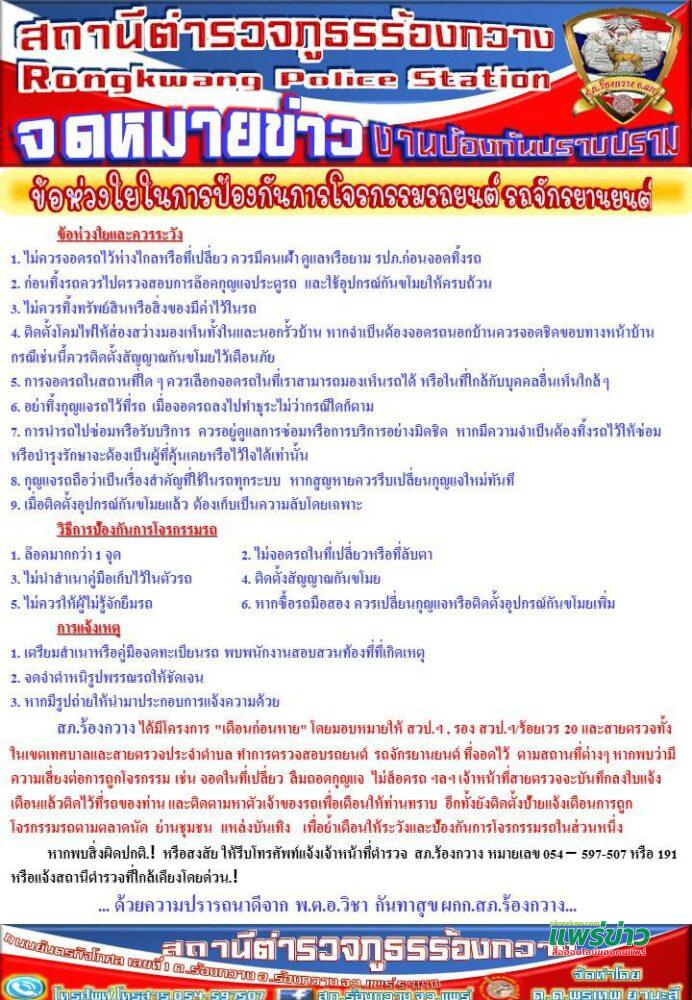 พ.ต.อ.วิชา กันทาสุข ผกก.สภ.ร้องกวาง จ.แพร่ เผยว่า สภ.ร้องกวางมีข้อห่วงใยในการป้องกันการโจรกรรมรถยนต์ รถจักรยานยนต์ข้อห่วงใยและควรระวัง ดังนี้