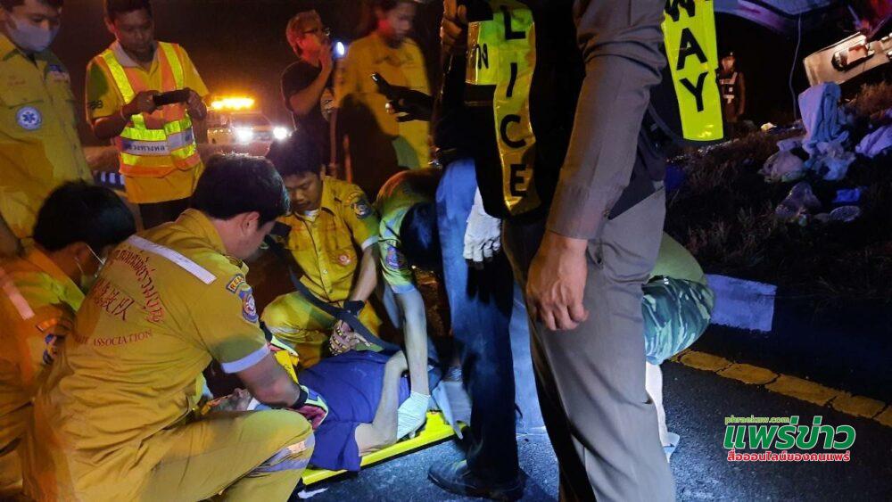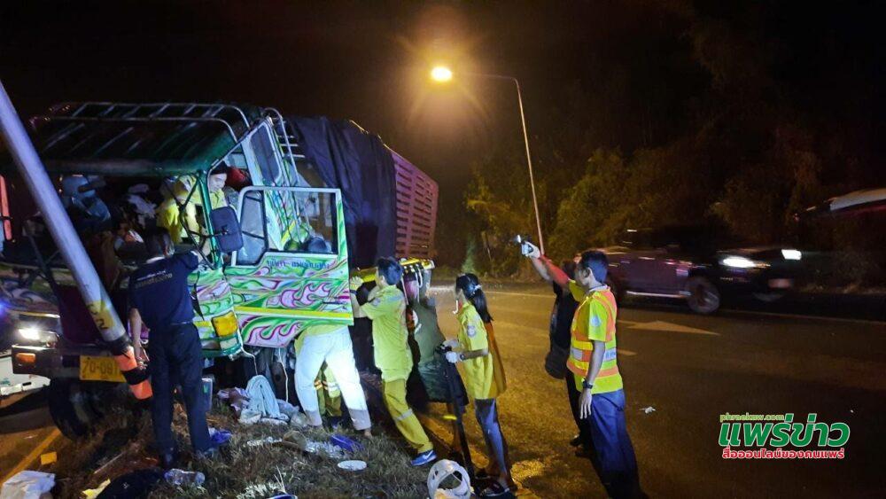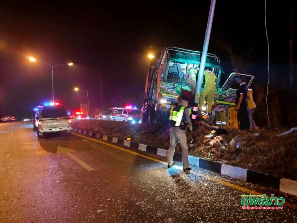 หลังรับแจ้งจึงประสานตำรวจสายตรวจ หน่วยกู้ชีพ-กู้ภัยเด่นชัย ร่วมบุญ ช่วยเหลือผู้ประสบเหตุที่เกิดเหตุพบรถยนต์บรรทุกสิบล้อ หมายเลขทะเบียน 70-0910 แพร่ ชนอัดติดเสาไฟกิ่ง จนเสาไฟหักเสียหาย ท้ายรถบรรทุกขวางถนนเลนขาขึ้น