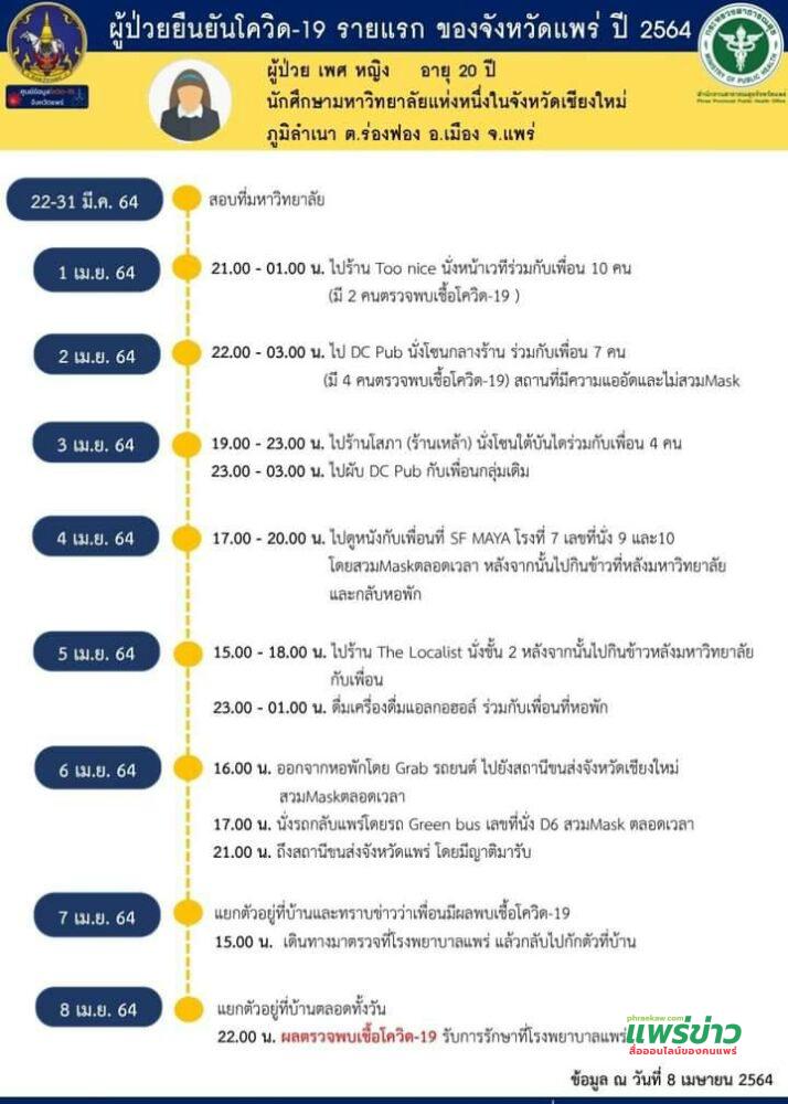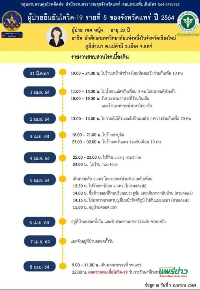 ไทม์ไลน์ผู้ป่วยโควิด จ.แพร่มาวันเดียว 5 ราย ทำเอาประชาชนชาวแพร่แทบช็อกเนื่องจากรักษาสถิติมานาน แต่เมื่อพบเข้าถึงกับอึ้ง โดยผู้ป่วยติดเชื้อประกอบด้วย