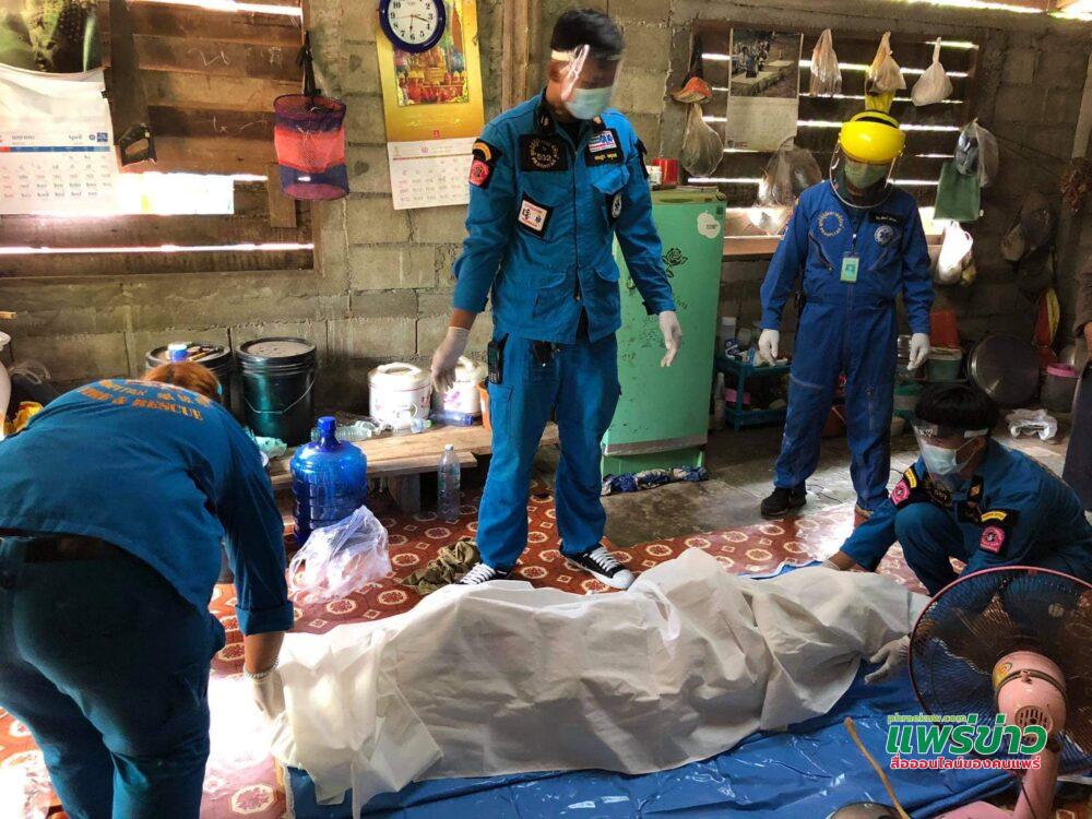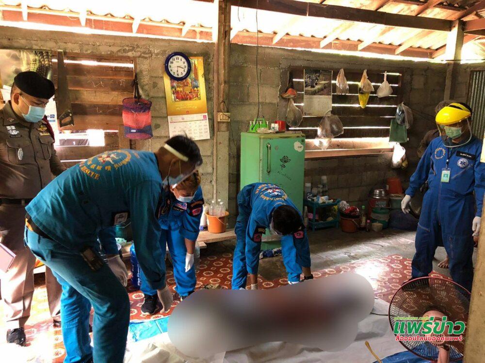 พบว่าบ้านที่เกิดเหตุเป็นบ้านปูนชั้นเดียวปลูกติดกับพื้นดิน เลขที่ 54/2 ม.2 ต.แม่ยางร้อง อ.ร้องกวาง จ.แพร่ พบร่าง นายฉลวย พวงพิลา อายุ 57 ปี สวมเสื้อยืดสีชมภู กางเกงผ้าอ่อน ใช้สายไฟแขวนคอกับขื่อ เสียชีวิตข้างตู้เย็น จึงได้บันทึกที่เกิดเหตุเป็นหลักฐาน