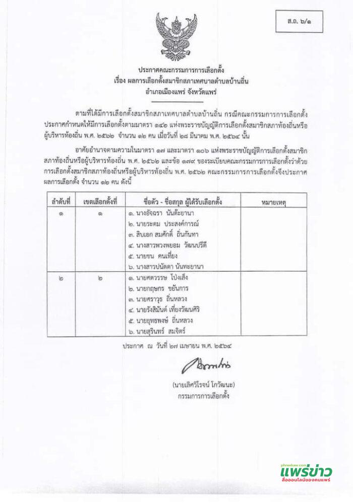 ด้วยคณะกรรมการการเลือกตั้งได้มีมติเห็นชอบให้ประกาศผลการเลือกตั้งนายกเทศมนตรีมาชิกสภาเทศบาลในจังหวัดแพร่ โดยกรรมการการเลือกตั้งได้โปรดลงนามประกาศผลการเลือกตั้งรายละเอียดปรากฏตามสิ่งที่ส่งมาด้วย ดังนั้น จึงขอให้ผู้อำนวยการการเลือกตั้งประจำจังหวัดแพร่ แจ้งผลการเลือกตั้งให้ผู้สมัครที่ได้รับเลือกตั้งทราบ และจัดทำทะเบียนสมาชิกสภาท้องถิ่นหรือผู้บริหารท้องถิ่น ตามข้อ 179 และข้อ 180 ของระเบียบคณะกรรมการการเลือกตั้งว่าด้วยการเลือกตั้งสมาชิกสภาท้องถิ่นหรือผู้บริหารท้องถิ่น พ.ศ.2562แล้วรายงานคณะกรรมการการเลือกตั้งทราบภายใน 7 วัน นับแต่วันที่ได้รับหนังสือ