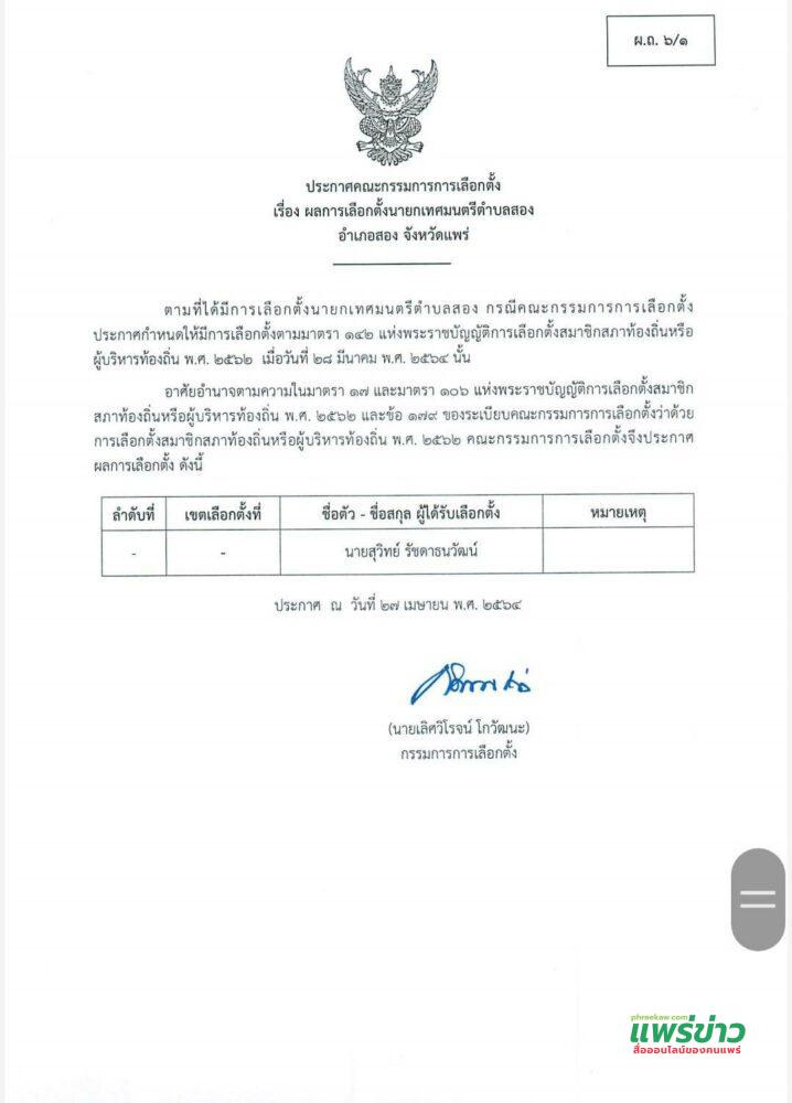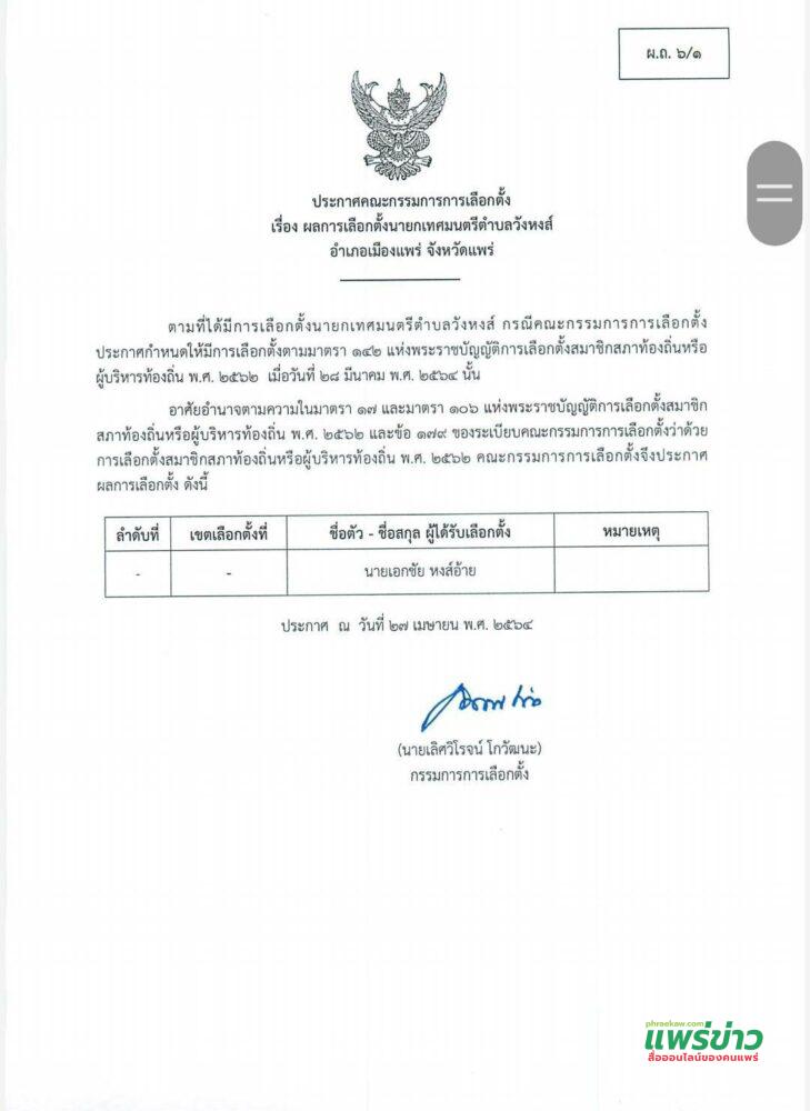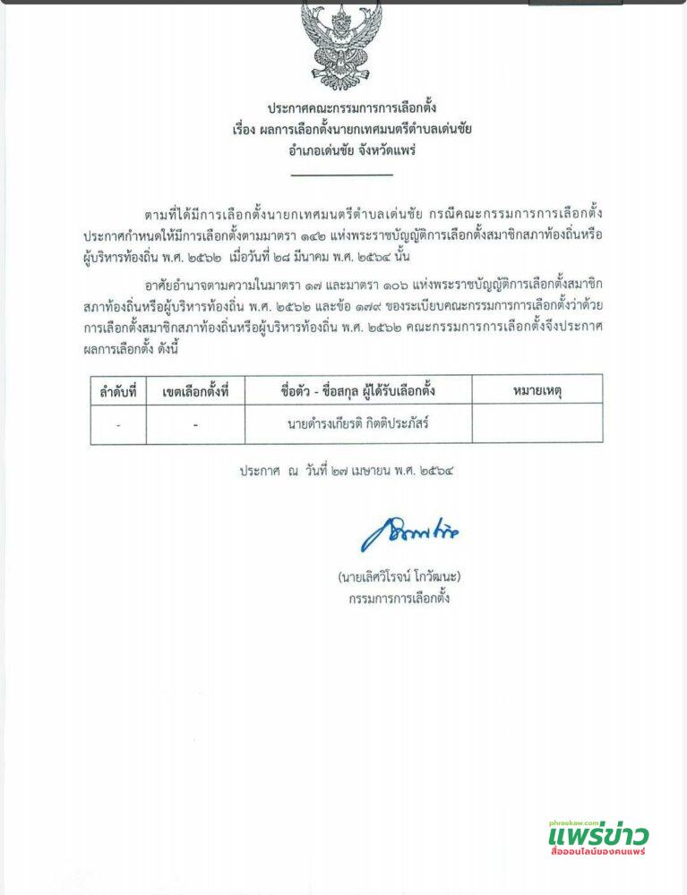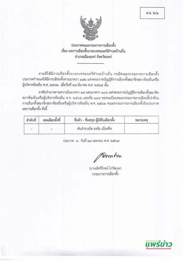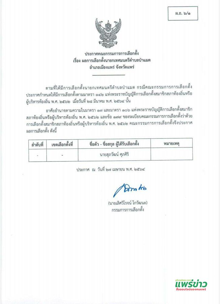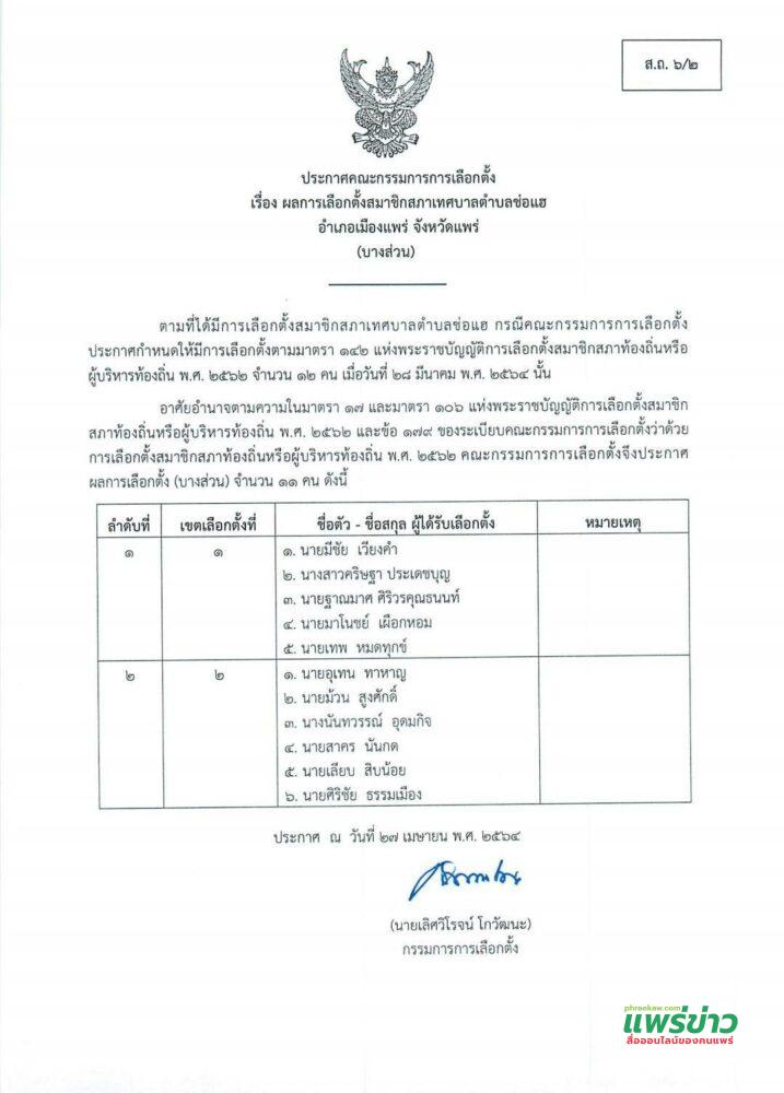 ทั้งนี้ ข้อความถูกต้องของประกาศผลการเลือกตั้งก่อนจะแจ้งผู้มีชื่อทราบด้วยจึงเรียนมาเพื่อโปรดพิจารณาดำเนินการ และขอให้แจ้งผู้ว่าราชการจังหวัดแพร่ และเทศบาลในจังหวัดแพร่ ทราบด้วยขอแสดงความนับถือนายกิตติพงษ์ บริบูรณ์รองเลขาธิการคณะกรรมการการเลือกตั้ง ปฏิบัติหน้าที่แทนเลขาธิการคณะกรรมการการเลือกตั้ง