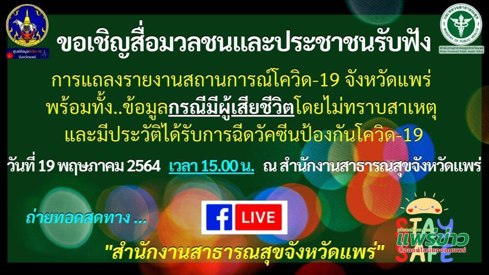 ขณะเดียวกันช่วงเช้าของวันนี้มีข่าวลือแพร่สะพัดว่ามีผู้นำท้องที่ในเขตอ.เมืองแพร่ เสียชีวิตจากผลข้างเคียงจากการฉีดวัคซีน ทำให้ สำนักงานสาธารณสุขจังหวัดแพร่ได้เชิญสื่อมวลชนและประชาชนรับฟัง การแถลงรายงาน สถานการณ์โควิด -19 จังหวัดแพร่ พร้อมทั้งข้อมูล กรณีมีผู้เสียชีวิต โดยไม่ทราบสาเหตุและมีประวัติที่ได้รับการฉีดวัคซีนป้องกันโควิด 19โดยแถลงข่าววันนี้ วันที่ 19 พฤษภาคม 2564 เวลา 15.00 น. ณ สำนักงานสาธารณสุขจังหวัดแพร่
