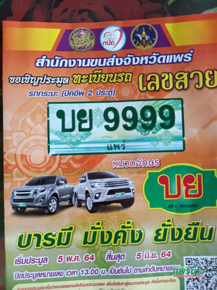 นายมานพ พุทธวงค์ ขนส่งจังหวัดแพร่ เปีดเผยว่า สำนักงานขนส่งจังหวัดแพร่จัดประมูลทะเบียนรถเลขสวย รถกระบะ(ปิคอัพ) หมวดอักษร บย มีเลขประมูลทั้งหมด 301เลขหมาย โดยประมูลผ่านระบบอินเตอร์เน็ต www.tabienrod.com เริ่มประมูลตั้งแต่วันที่ 5 พฤษภาคม 2564 สิ้นสุดวันที่ 5 มิถุนายน 2564 ปิดประมูลหมายเลข เวลา 13.00 น.เป็นต้นไป ซึ่งแผ่นป้ายทะเบียนกราฟิกส์ จะออกให้เฉพาะผู้ที่ได้จากการประมูลเท่านั้น และถือเป็นกรรมสิทธิ์ของผู้ได้รับที่สามารถใช้มอบเป็นของขวัญ หรือโอนซื้อขาย เปลี่ยนแปลงกรรมสิทธิ์ให้บุคคลอื่นได้ ซึ่งนอกจากจะได้ทะเบียนรถตามที่ต้องการแล้วยังมีส่วนช่วยส่งเสริมด้านความปลอดภัยในการใช้รถใช้ถนน สนับสนุนการรณรงค์ส่งเสริมการป้อง กันอุบัติเหตุบนท้องถนน ทั้งนี้ผู้สนใจเข้าร่วมประมูลทะเบียนรถเลขสวย สอบถามข้อมูลเพิ่มเติมได้ที่ สำนักงานขนส่งจังหวัดแพร่โทร 054-652544 ฝ่ายทะเบียนรถ 054-652540 หรือ Call Center ๑๕๘๔