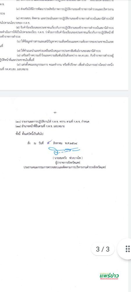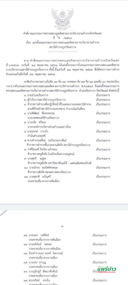 ผู้สื่อข่าวรายงานว่า ตามที่ นายสมหวัง พ่วงบางโพ ผู้ว่าราชการจังหวัดแพร่,ประธานคณะกรรมการตรวจสอบและติดตามการบริหารงานตำรวจจังหวัดแพร่ ได้มีคำสั่ง คณะกรรมการตรวจสอบและติดตามการบริหารงานตำรวจจังหวัดแพร่ ที่ 6 ก2564 เรื่อง แต่งตั้งคณะกรรมการตรวจสอบและติดตามการบริหารงานตำรวจ สถานีตำรวจภูธรร้องกวาง สั่ง ณ วันที่ 9 สิงหาคม พ.ศ.2564 ความว่าตาม คำสั่งคณะกรรมการตรวจสอบและติดตามการบริหารงานตำรวจจังหวัดแพร่ ที่ 6/2564 ลงวันที่ 28 พฤษภาคม 2562 ได้แต่งตั้งกรรมการในคณะกรรมการตรวจสอบและติดตาม การบริหารงานสถานีตำรวจภูธรร้องกวาง ทั้งนี้ ตั้งแต่วันที่ 28 พฤษภาคม 2562 ซึ่งได้ครบวาระการดำรง ตำแหน่งแล้วเมื่อวันที่ 28 พฤษภาคม 2564 อาศัยอำนาจตามความในข้อ 33 ข้อ 14 วรรคสอง ข้อ 27 ข้อ 29 และข้อ 30 ของระเบียบ ก.ต.ช.ว่าด้วยคณะกรรมการตรวจสอบและติดตามการบริหารงานตำรวจ พ.ศ.2549 จึงแต่งตั้งคณะกรรมการ ตรวจสอบและติดตามการบริหารงานตำรวจสถานีตำรวจภูธรร้องกวาง อ.ร้องกวาง จ.แพร่ ดังต่อไปนี้