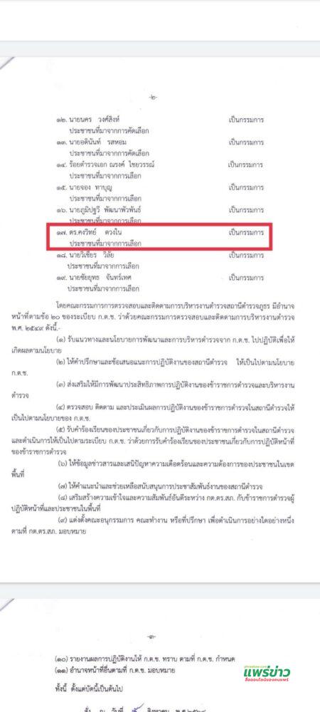 1.นายอำเภอร้องกวาง 2. ผู้กำกับการสถานีตำรวจภูธรร้องกวาง 3. ข้าราชการตำรวจซึ่งปฏิบัติหน้าที่ในแต่ละงานของสถานีตำรวจ ตามที่หัวหน้าสถานีตำรวจมอบหมาย จำนวนไม่เกินสี่คน 4. นายพิพัฒน์ ซื่อทรงธรรม นายกเทศมนตรีตำบลร้องกวาง 5. นายจรัล ศรีทอง นายก อบต.แม่ยางร้อง 6. นายมรกต กาบบัว กำนันตำบลทุ่งศรี 7. ดาบตำรวจเสงี่ยม ธนกิจประภาพันธ์ ข้าราชการตำรวจชั้นประทวนสังกัด สถานีตำรวจภูธรร้องกวาง 8. ว่าที่ร้อยตรี วีรภัทร แก้วทอง ข้าราชการครูสังกัด ร.ร.ร้องกวางอนุสรณ์ 9. นายศุกรี อยู่สุข ข้าราชการครูสังกัด มหาวิทยาลัยแม่โจ้แพร่เฉลิมพระเกียรติ 10. นายนักรบ จองไพจิตรสกุล ข้าราชการสังกัด หมวดทางหลวงร้องกวาง