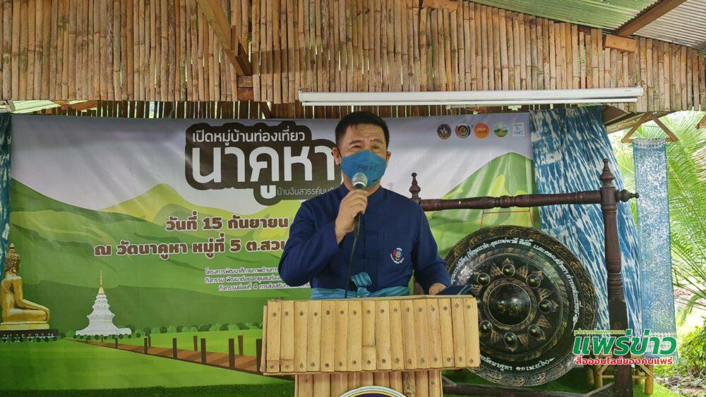 เมื่อเวลา 11.00 น. วันที่ 15 ก.ย. 64 นายสมหวัง พวงบางโพ ผู้ว่าราชการจ.แพร่ เป็นประธานเปิดหมู่บ้านท่องเที่ยวหมู่บ้านชุมชนท่องเที่ยว แบบ New Normal กิจกรรมการส่งเสริมการท่องเที่ยว บ้านนาคูหา ต.สวนเขื่อน อ.เมืองแพร่ ซึ่งเป็นหมู่บ้านในหุบเขา ที่มีวิถีชีวิตแบบชนบท มีธรรมชาติที่งดงาม อากาศบริสุทธิ์ เป็นดินแดนที่ได้ชื่อว่าเป็นแหล่งโอโซนอันดับ7 ของประเทศ ซึ่งมีกิจกรรมที่ชาวบ้านทำหัตถกรรมที่ขึ้นชื่อ เป็นหนึ่งเดียวของจังหวัด ได้แก่ การทำบ่อเตา(สาหร่าย) การทำสวนห้อมแห่งของจ.แพร่ การทำกาแฟ การทำกาละแมเตา โดยมีนายสุสังข์ ชุ่มมะโน พัฒนาการจังหวัดแพร่ กล่าวรายงาน พร้อมด้วยนายอาทร พิมชนก ผู้ตรวจราชการกรมการพัฒนาชุมชน กระทรวงมหาดไทย ส่วนราชการจ.แพร่ นายสมศักดิ์ สุขประเสริฐ นายอำเภอเมืองแพร่ อปท. ประชาชน ร่วมงาน